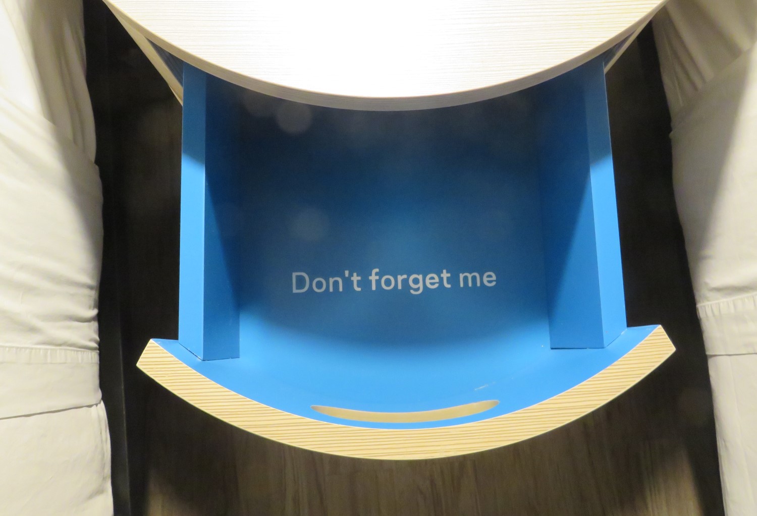 We left the con shortly before 7 and adjourned to our hotel ten minutes down the road, away from the presumable partying, which is usually not our thing. We switched to a different hotel this year, a newer model with modern flourishes such as a Jetsons-shaped table, a radio that had no alarm or clock or intuitive controls, a nightstand with built-in USB ports on each side, elevators that require you to push a floor button before you step in, and lamps set up for that irritating traveling game, Guess Which Switches Belong to Which Lights on the Far Side of the Room. We didn’t achieve 100% on that game till the next morning.