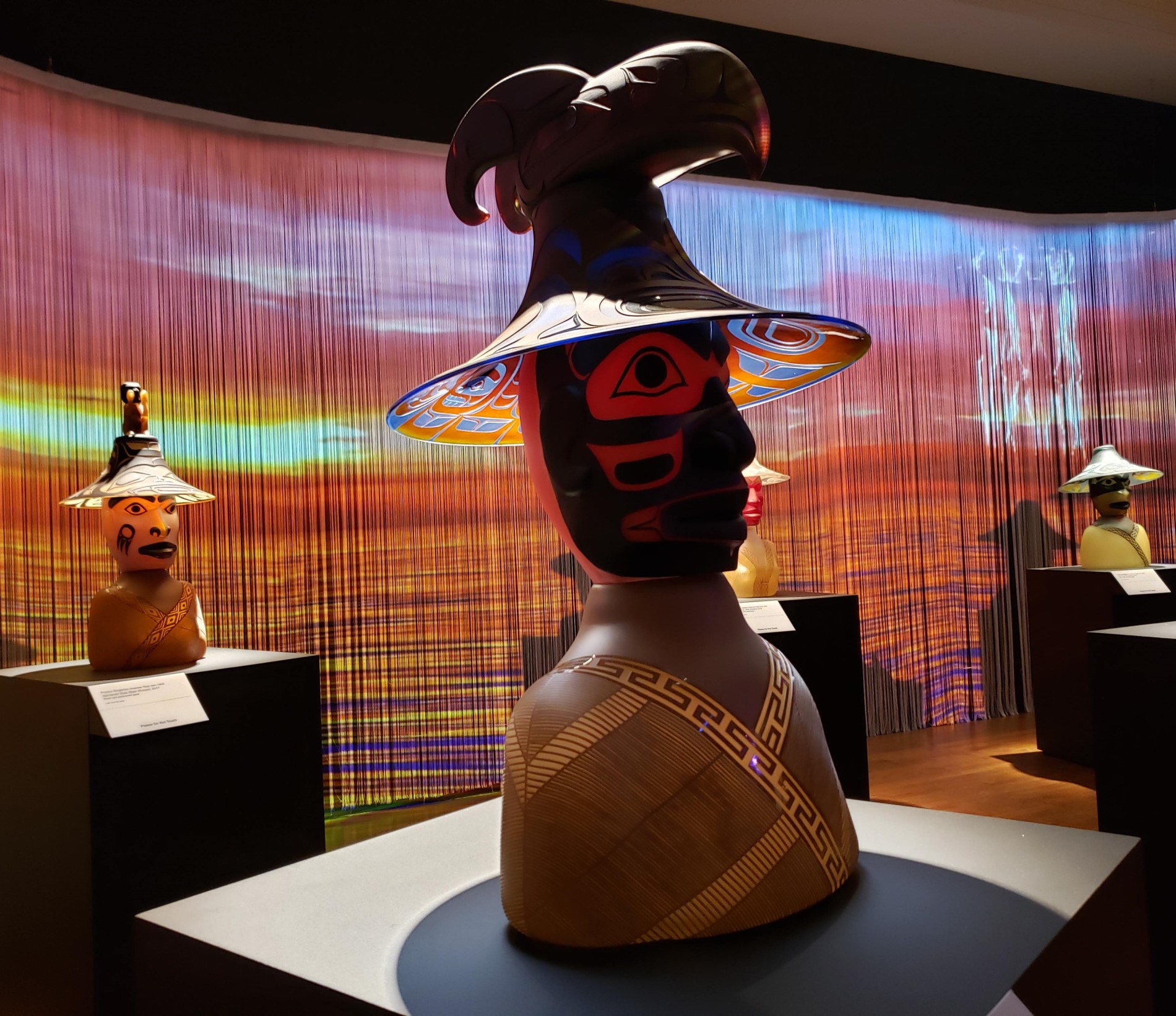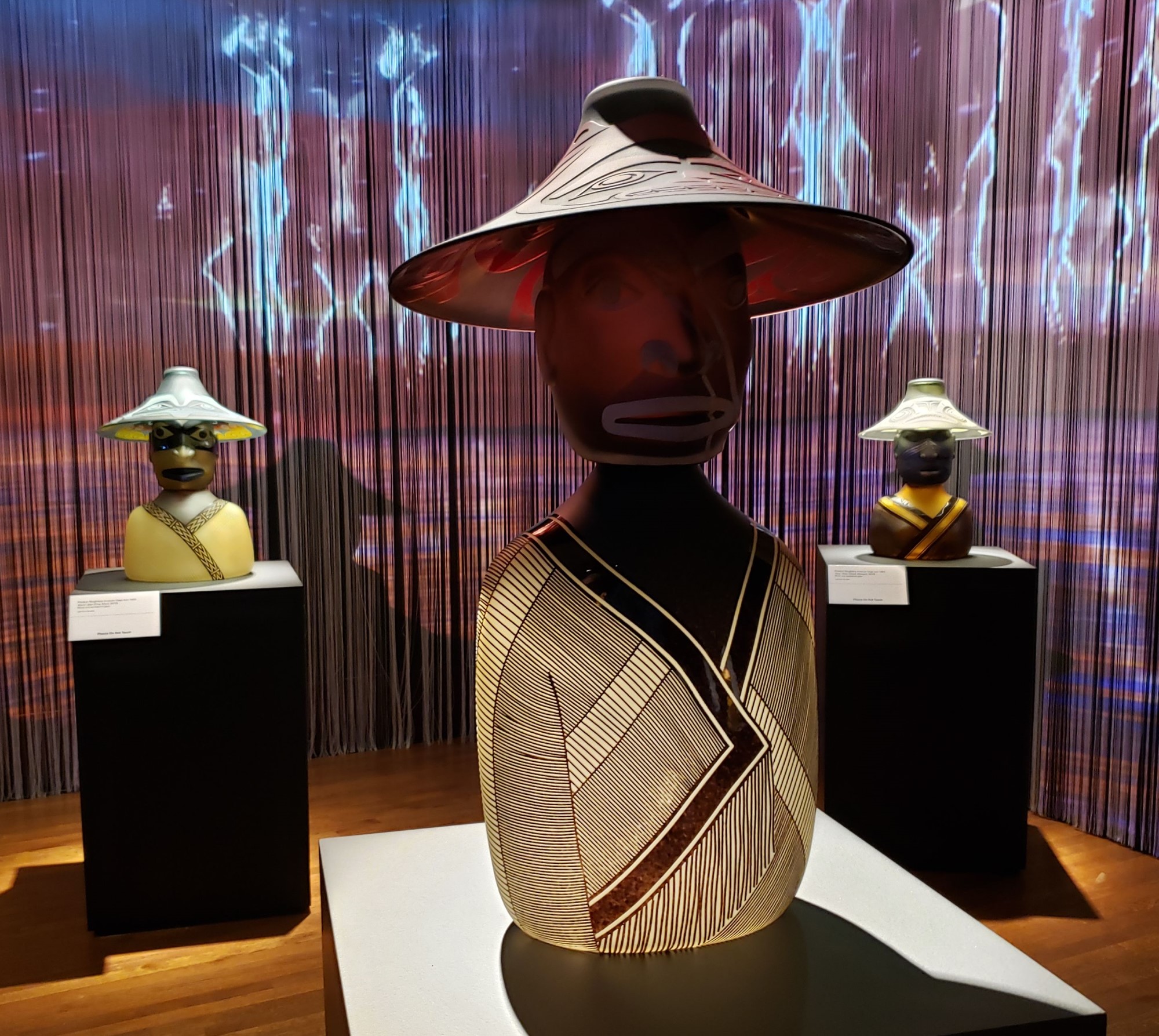 In addition to Jingle Rails, another temporary exhibit called “Preston Singletary: Raven and the Box of Daylight” showcases works by the Tlingit artist through March 9, 2025. Much like the Lume at Newfields, the walls have been turned into light shows to accompany the pieces they surround.