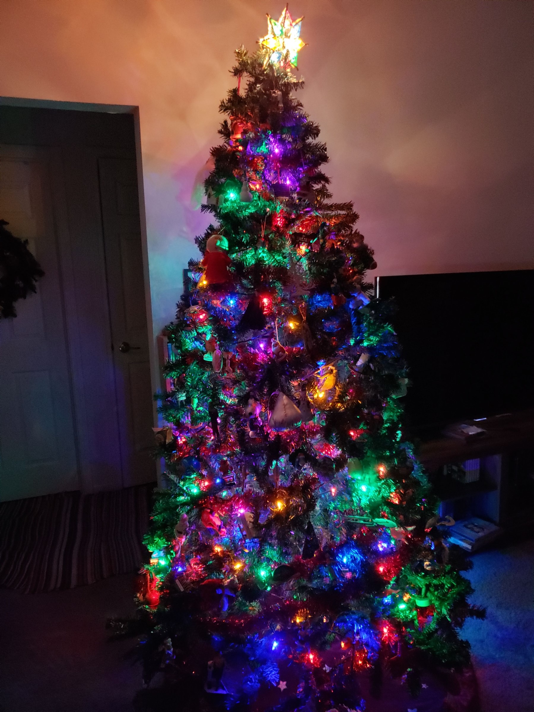 7.5-foot Christmas tree in dark living room with light strands and star turned on.