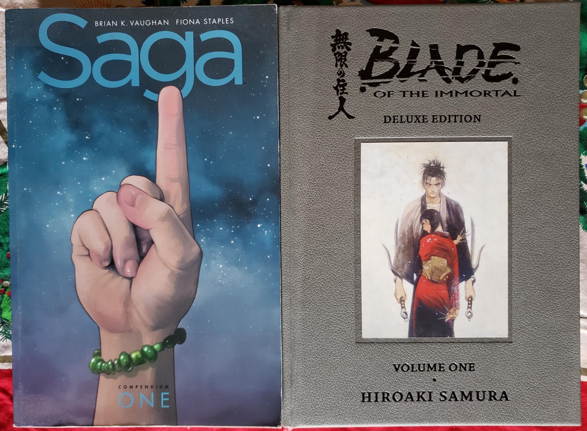 9. Hiroaki Samura, Blade of the Immortal Deluxe Edition Vol. 1 (2020). Fun trivia: I have read manga! It’s never been a full-time part of my reading diet, but I’ve sampled a few in my time, though admittedly nothing recent. I followed along for a short time when Dark Horse Comics was reprinting this 1993-2012 saga in monthly singles that felt like too-short installments, but it works better at length. This hardcover omnibus (another discounted convention find courtesy of Gem City Books) collects the first three Dark Horse trades’ worth of chapters about a ronin cursed with a magical worm infestation that grants him regenerative powers like Wolverine and Deadpool, but which mean he can never experience a warrior’s honorable death…though he can still suffer. It’s interesting for me to finally meet Our Antihero early on, when he’s still on his way to going full nihilist, but isn’t all the way there yet.