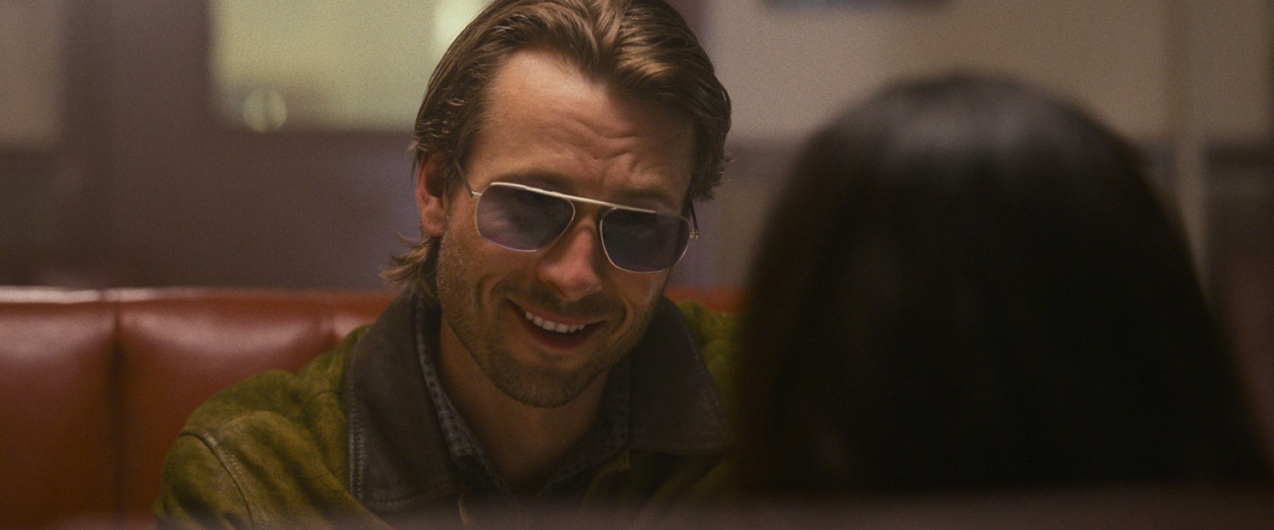 Glen Powell smiling in sunglasses, sitting in a diner.