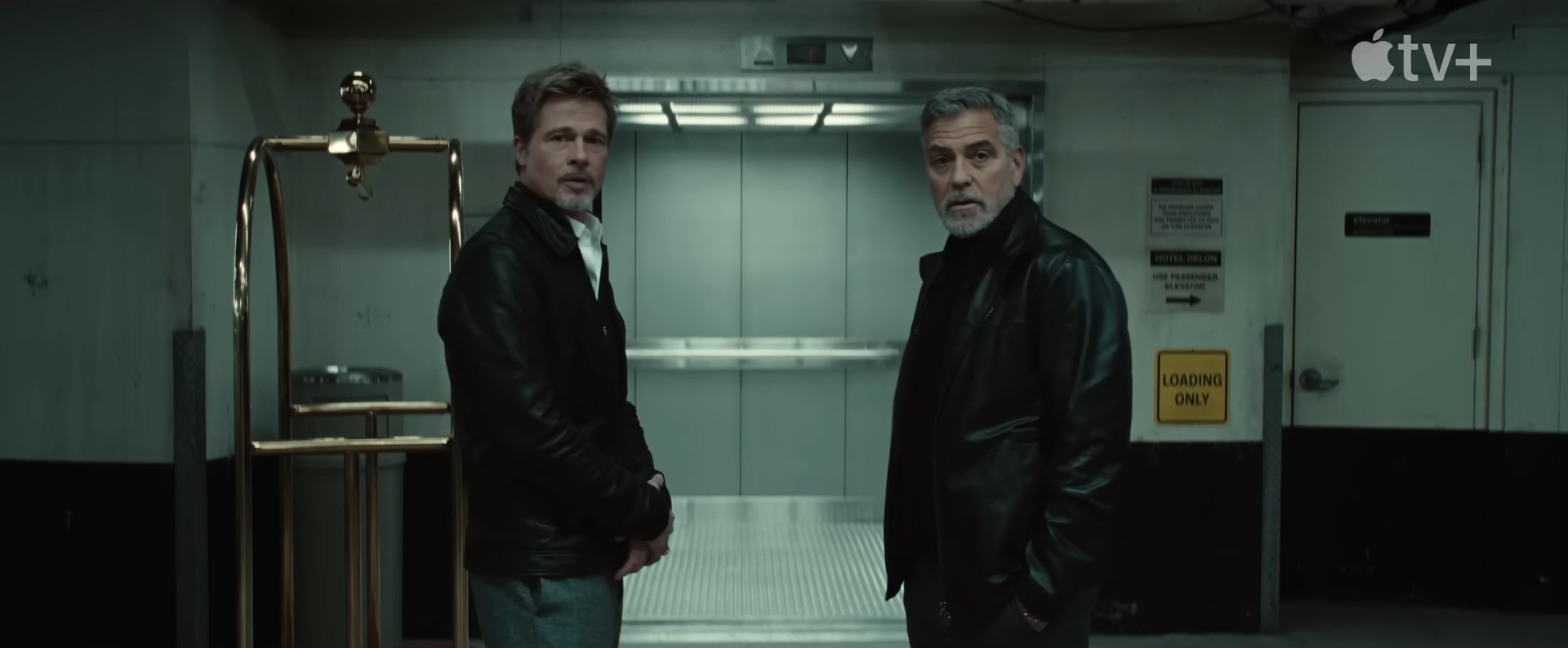 Brad Pitt and George Clooney in an underground garage, staring agape at an offscreen surprise.