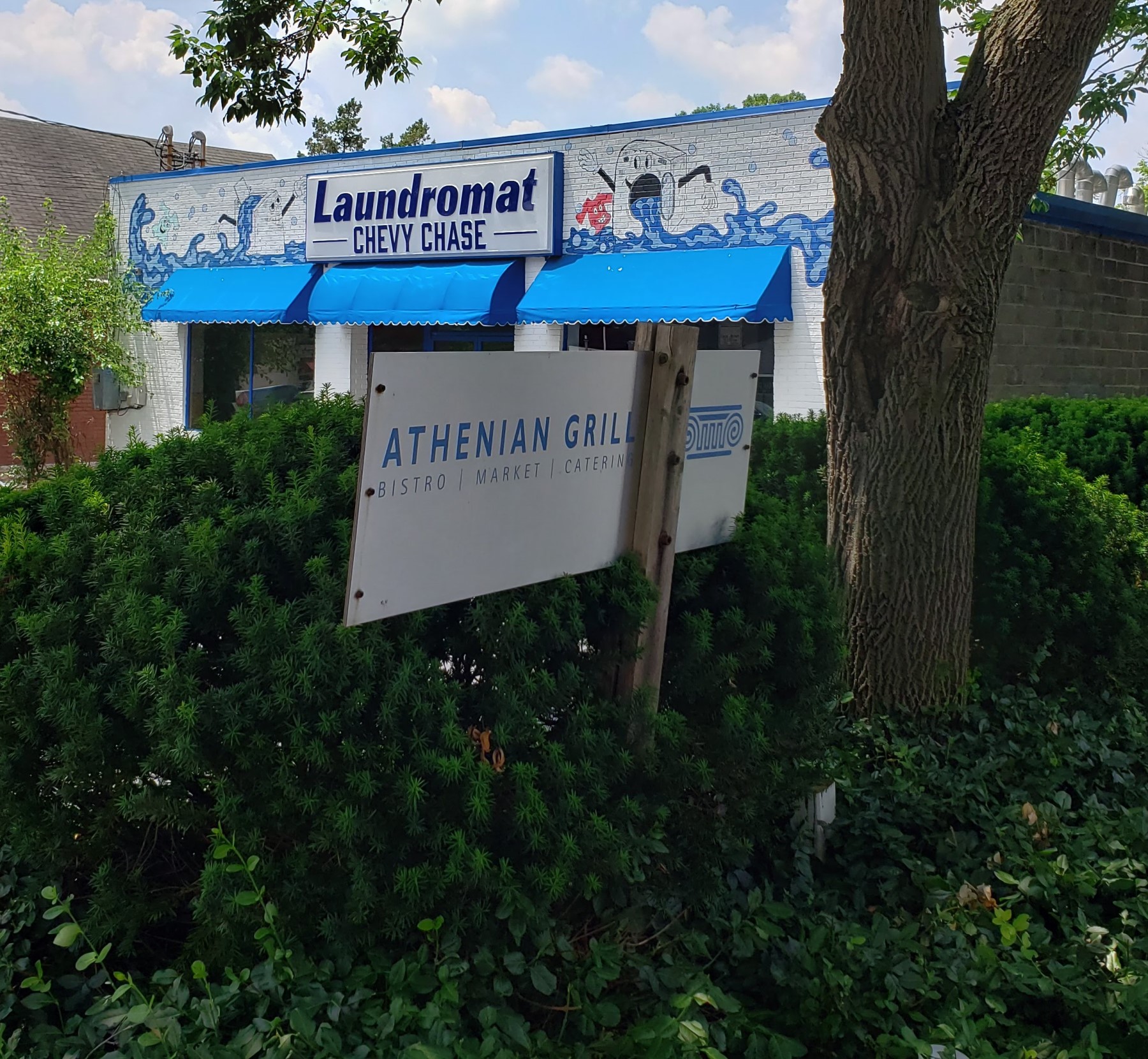 Tiny Athenian Grill sign in a parking lot nearly swallowed by bushes. Next door behind the sign is a laundromat in a white brick building with blue water sprays painted above the windows.