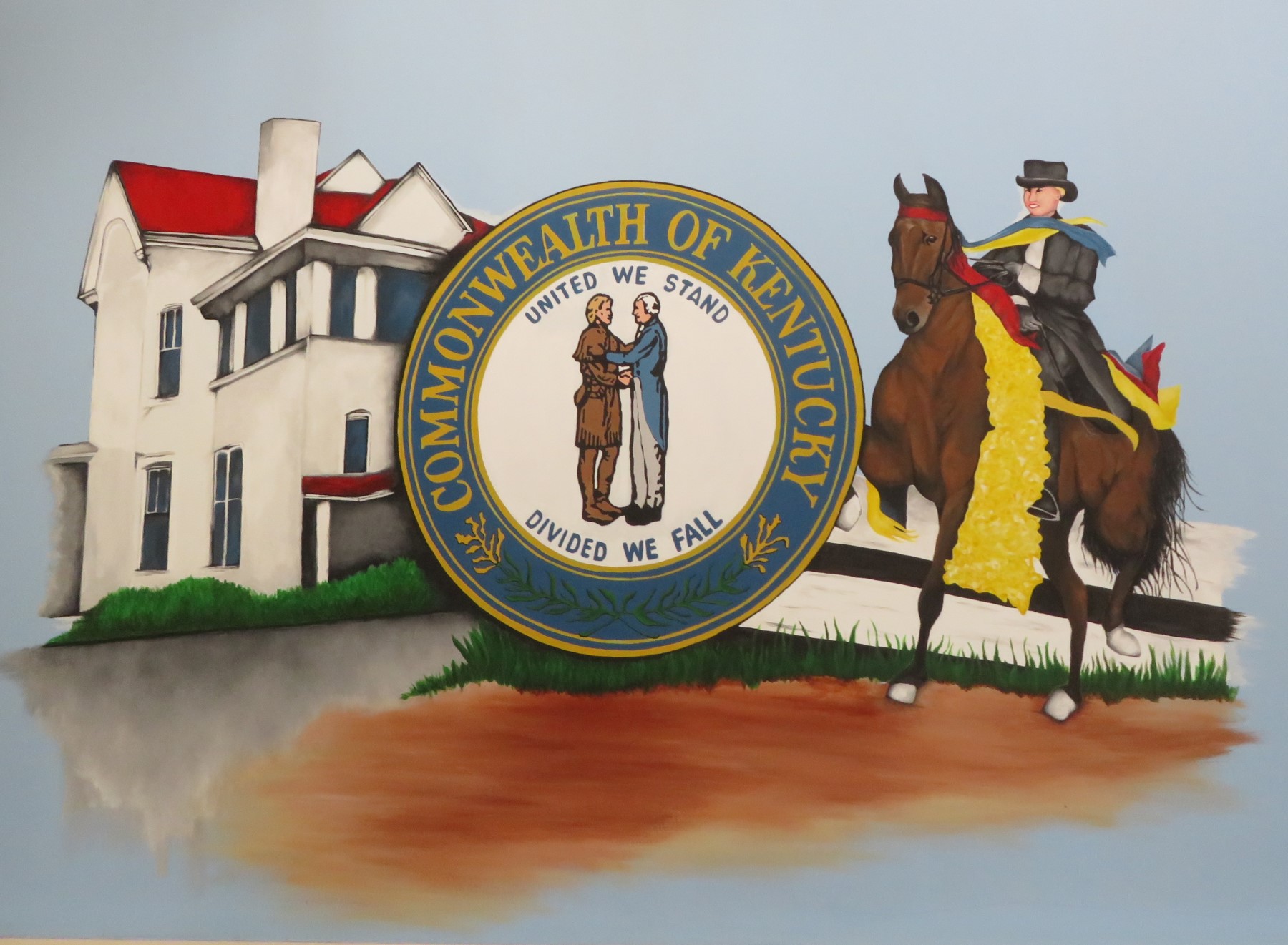 Commonwealth of Kentucky seal painted on a wall, next to a horsewoman and a two-story house.