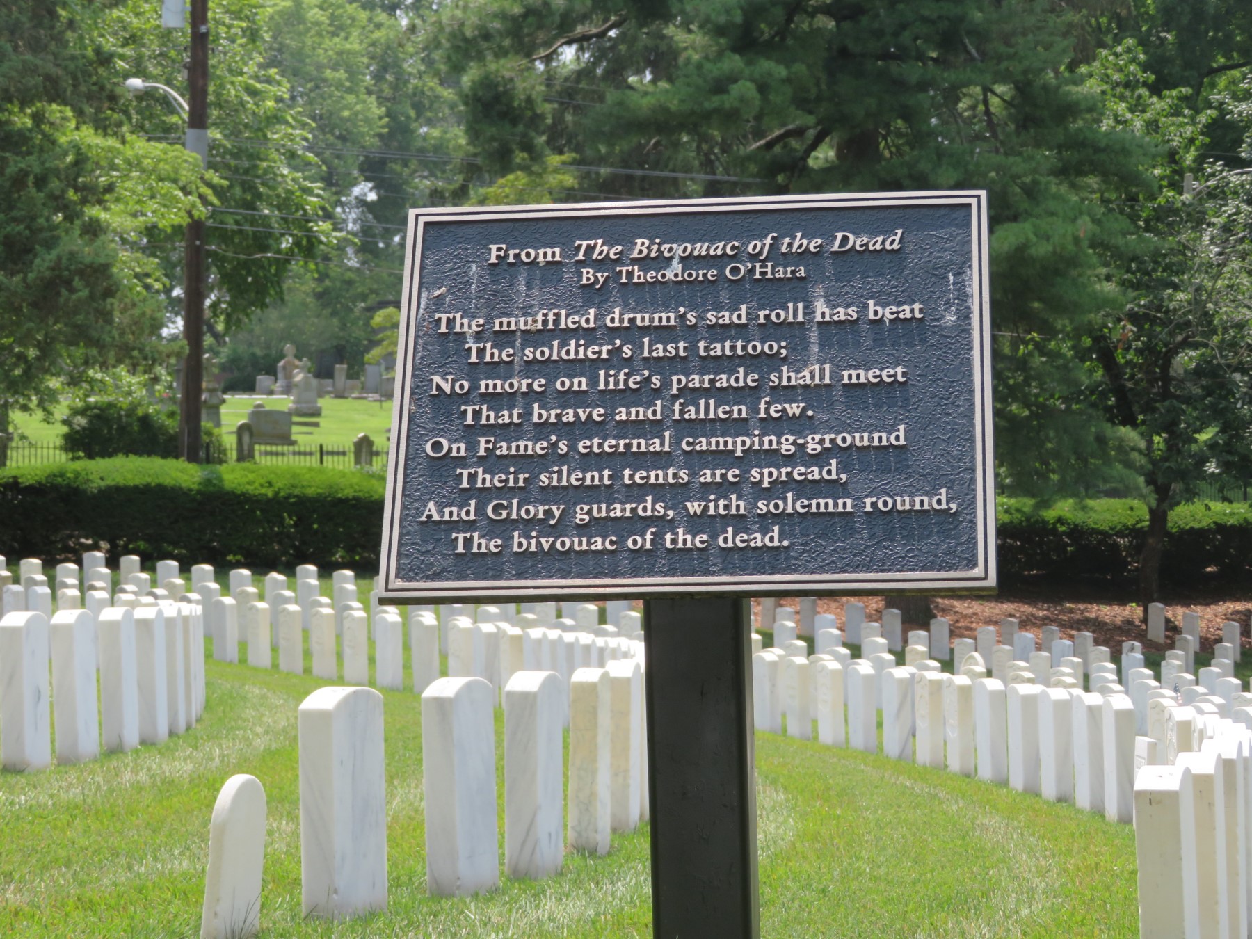 Plaques throughout their section quote “The Bivouac of the Dead”, written by local poet Theodore O’Hara, who served under Breckinridge.