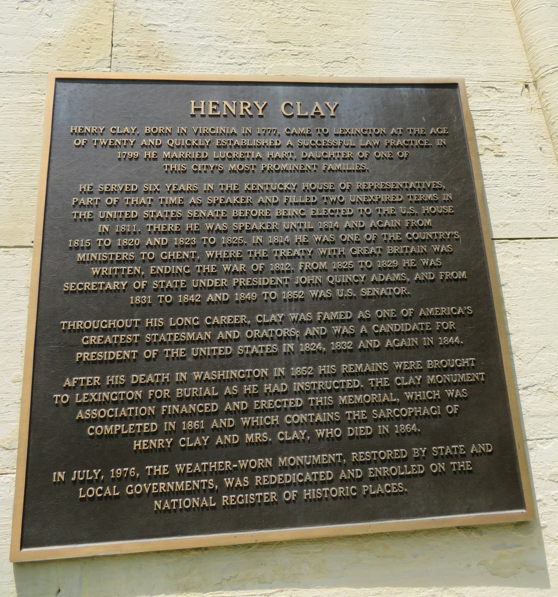 The Henry Clay Monument and Mausoleum, built in 1857. His wife Lucretia joined him upon her passing in 1864.