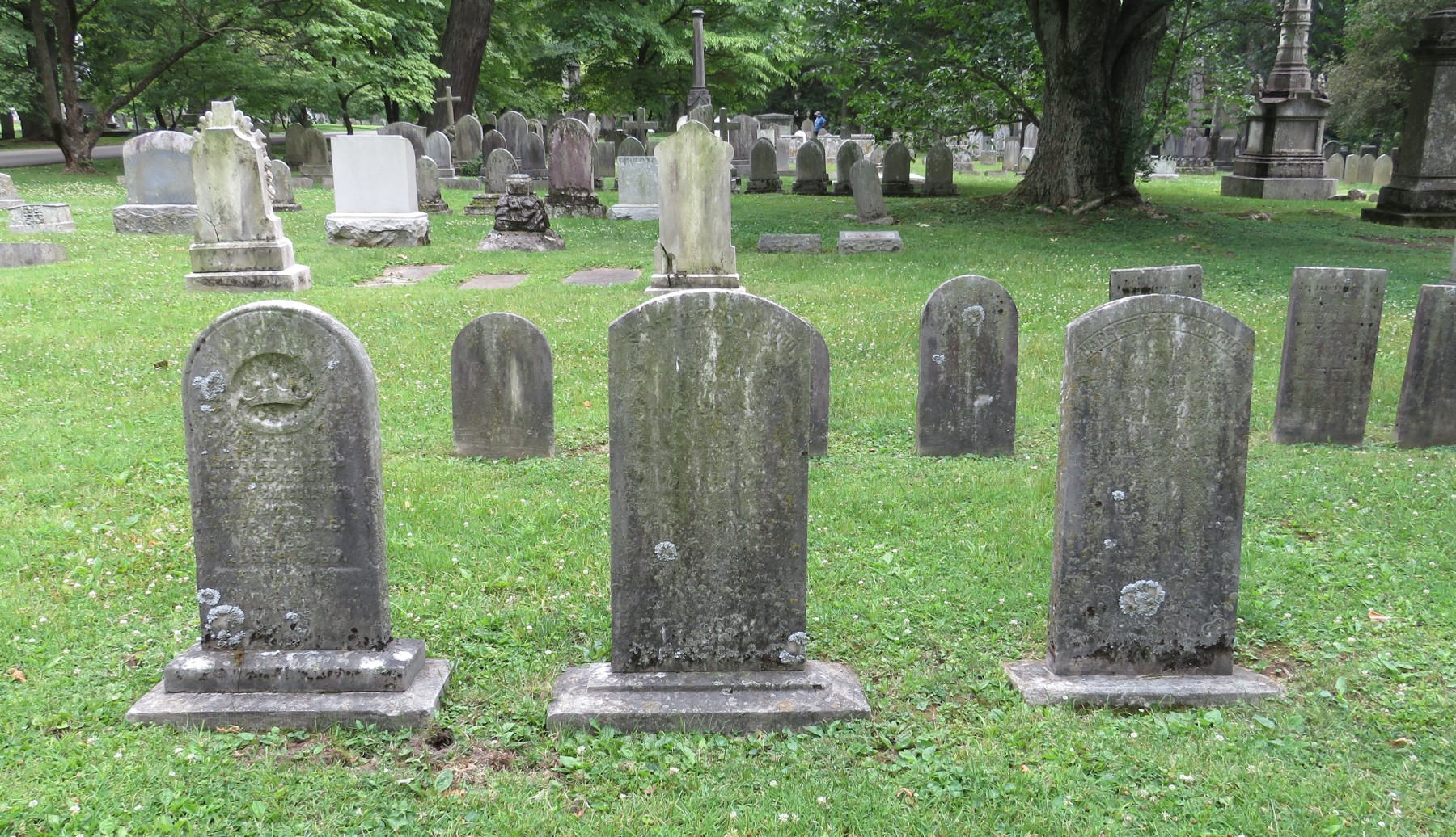 I’m confident the tombstone at right is that of his wife Harriet, but the adjacent headstones were too eroded to make out.
