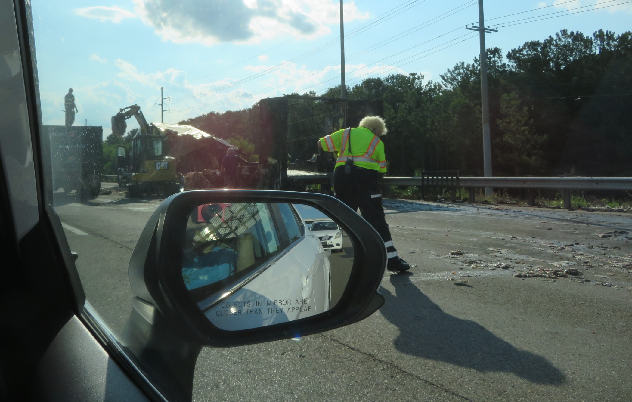 Before we could enjoy ourselves there, once again fate dropped major road blockage in our path as we merged from I-75 onto I-40 shortly after 6 p.m., only to find traffic at a near-standstill and diverted to the leftmost lanes. We later found out a mattress had fallen off a truck, went under a semi and knocked a fuel line loose, causing it to catch fire and burn all the way down. We’d missed the part where the road was at a dead stop for twenty minutes. We were too late to witness anything incendiary in progress, but we laid eyes on the remains after firefighters were done with their part.