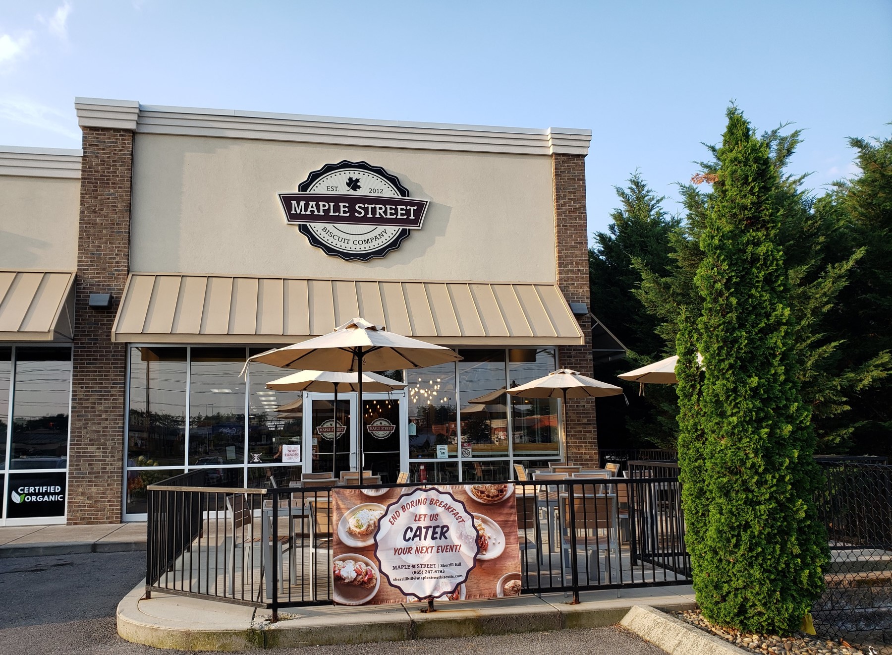 I’d been concerned our pet-friendly hotel might turn noisy at night, but apparently we’d shared the place only with very good doggos. We left early and grabbed breakfast from Maple Street Biscuit Company, a mostly Southern chain out of Jacksonville dating back to 2012, now with a few dozen locations. (The closest to our house are a couple in the Cincinnati vicinity.) Country music welcomed us over the P.A. as we walked in.