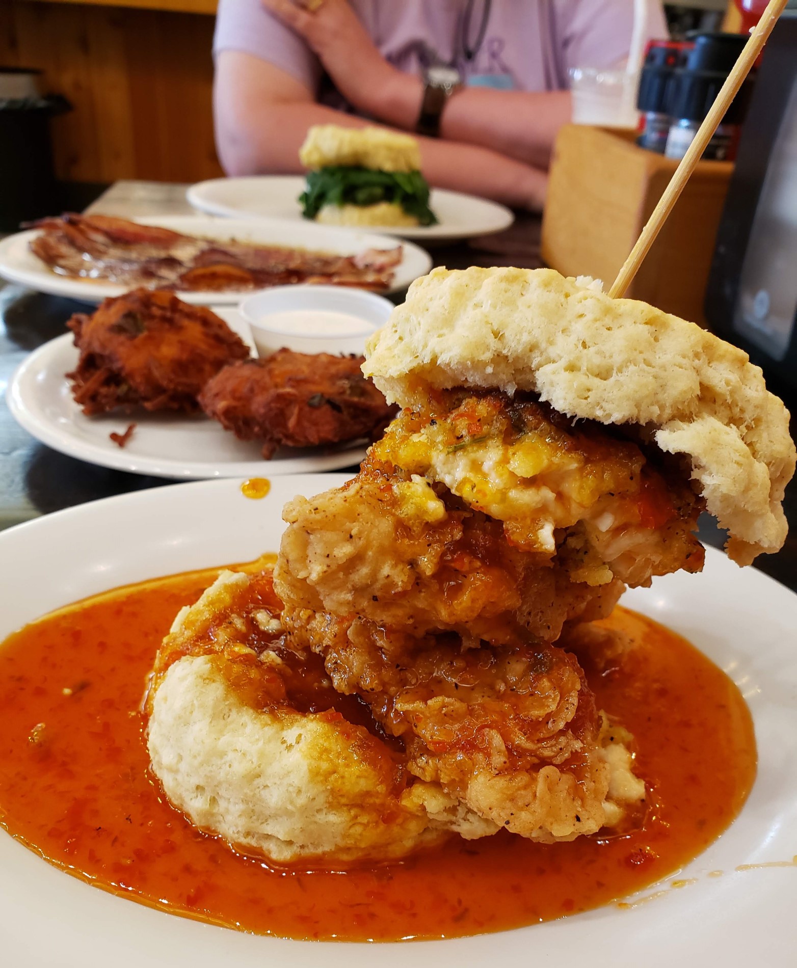 Naturally I had no choice but to try the Squawking Good, as seen in a season-2 episode of Food Network’s Guilty Pleasures. Behold a biscuit topped with fried chicken, goat cheese, and pepper jelly, served with their “smashbrowns”. I paired that with a caramel toffee crunch latte, though I usually dial down my caffeine intake on vacation so we don’t have to stop for restrooms so often. Yep, I’ve gotten that old.