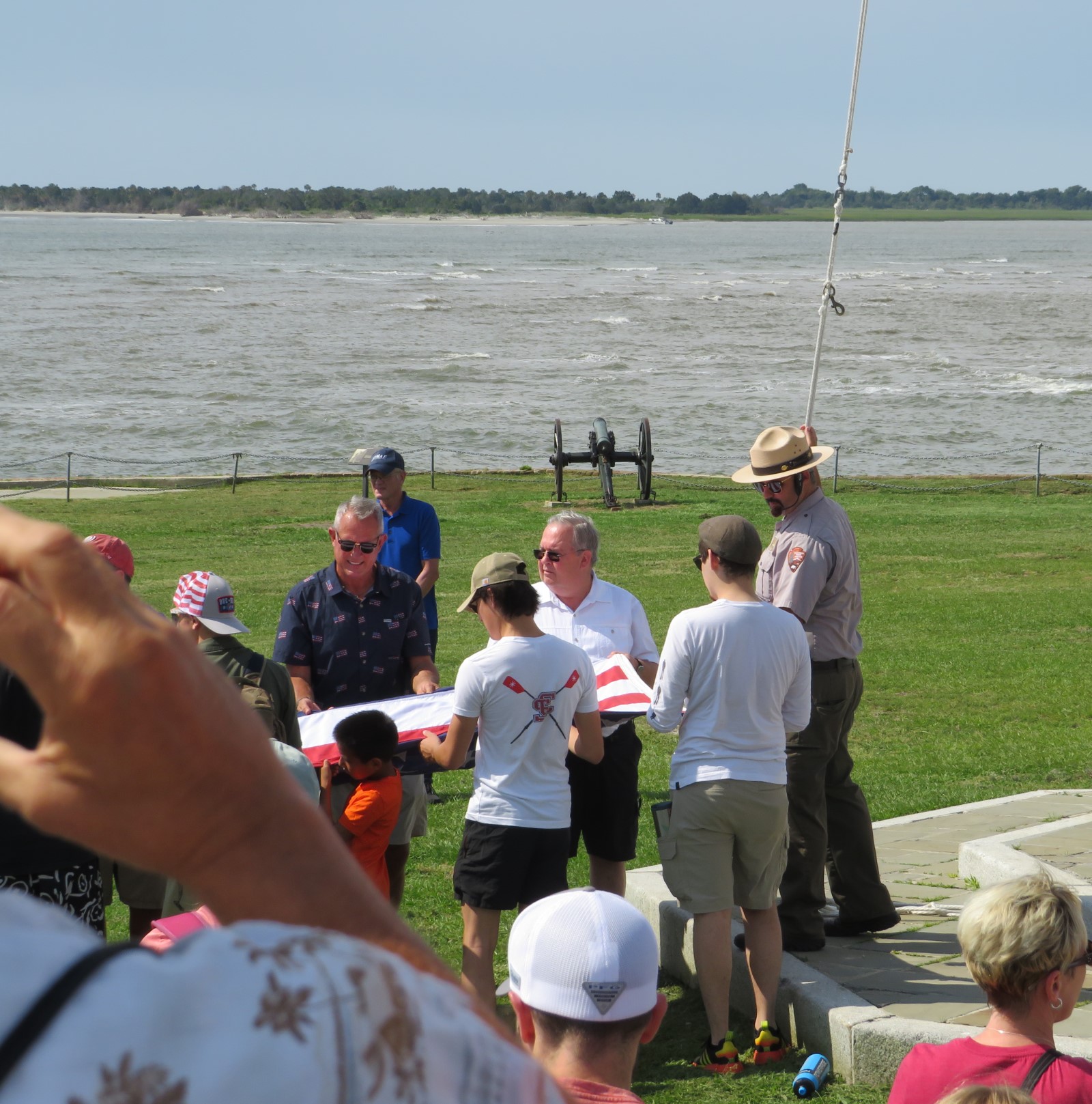 The rangers in charge of Fort Sumter and Fort Moultrie National Historical Park do not pretend otherwise. Upon our arrival they conducted the daily flag-raising program in which volunteering guests can assist in hoisting the 33-star flag up the pole to replace the losing side’s own. (They carefully noted this was a “program” and not a “ceremony”. Legal flag-care reasons, one presumes.) Their accompanying speech, though enlivened by the ranger’s own lighthearted remarks, unambiguously hammered on the blatant slavery aspect of South Carolina’s intentions.