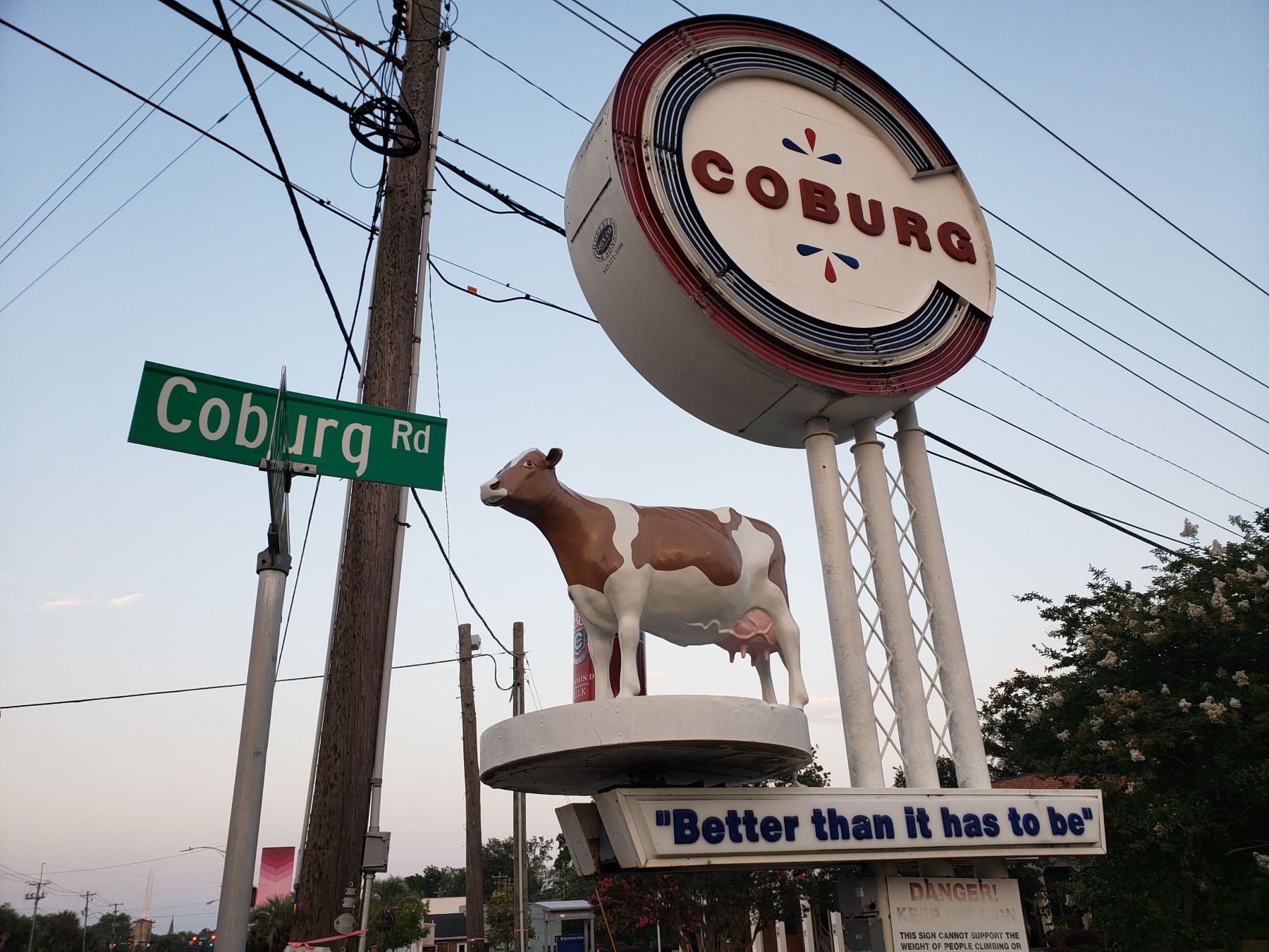 Afterward we made time for one last, quick roadside attraction half a mile away from The Glass Onion: a visit to the Coburg Cow, likewise on Savannah Highway. Since 1959 she’s stood tall in the West Ashley neighborhood, where she used to be the mascot of a dairy farm/supplier that left her in place even after they moved away and eventually got bought out by Borden. Her position is manually changed on occasion as a sort of makeshift weather vane and/or symbolic meteorologist. I imagine it was a huge deal when she was temporarily taken down in ’89 and sheltered from the onslaught of Hurricane Hugo.