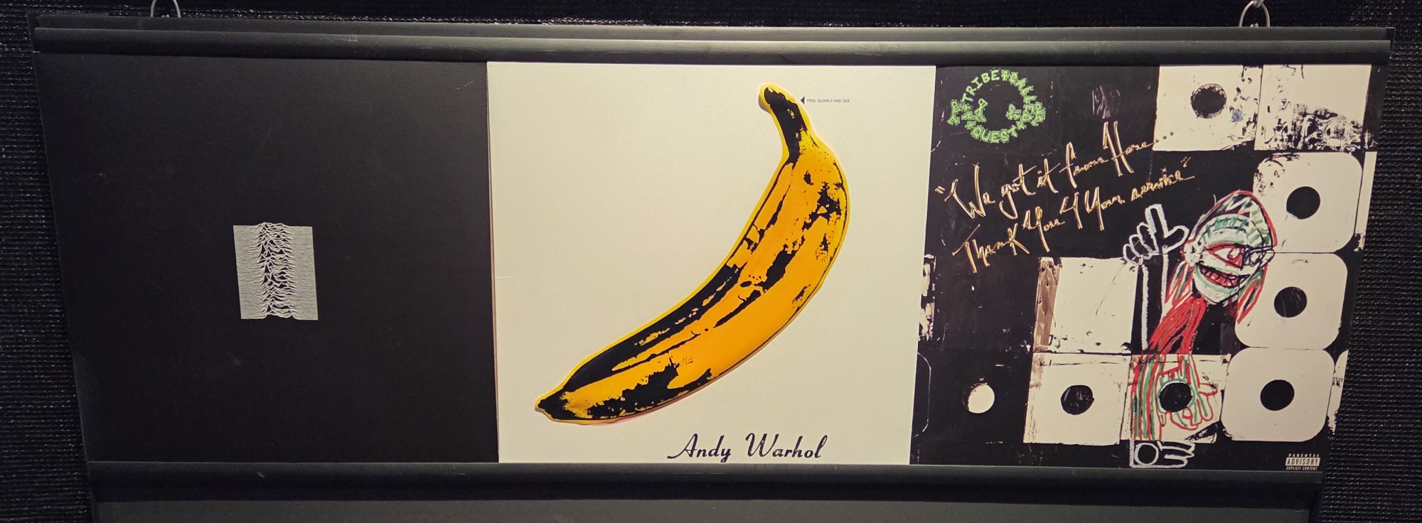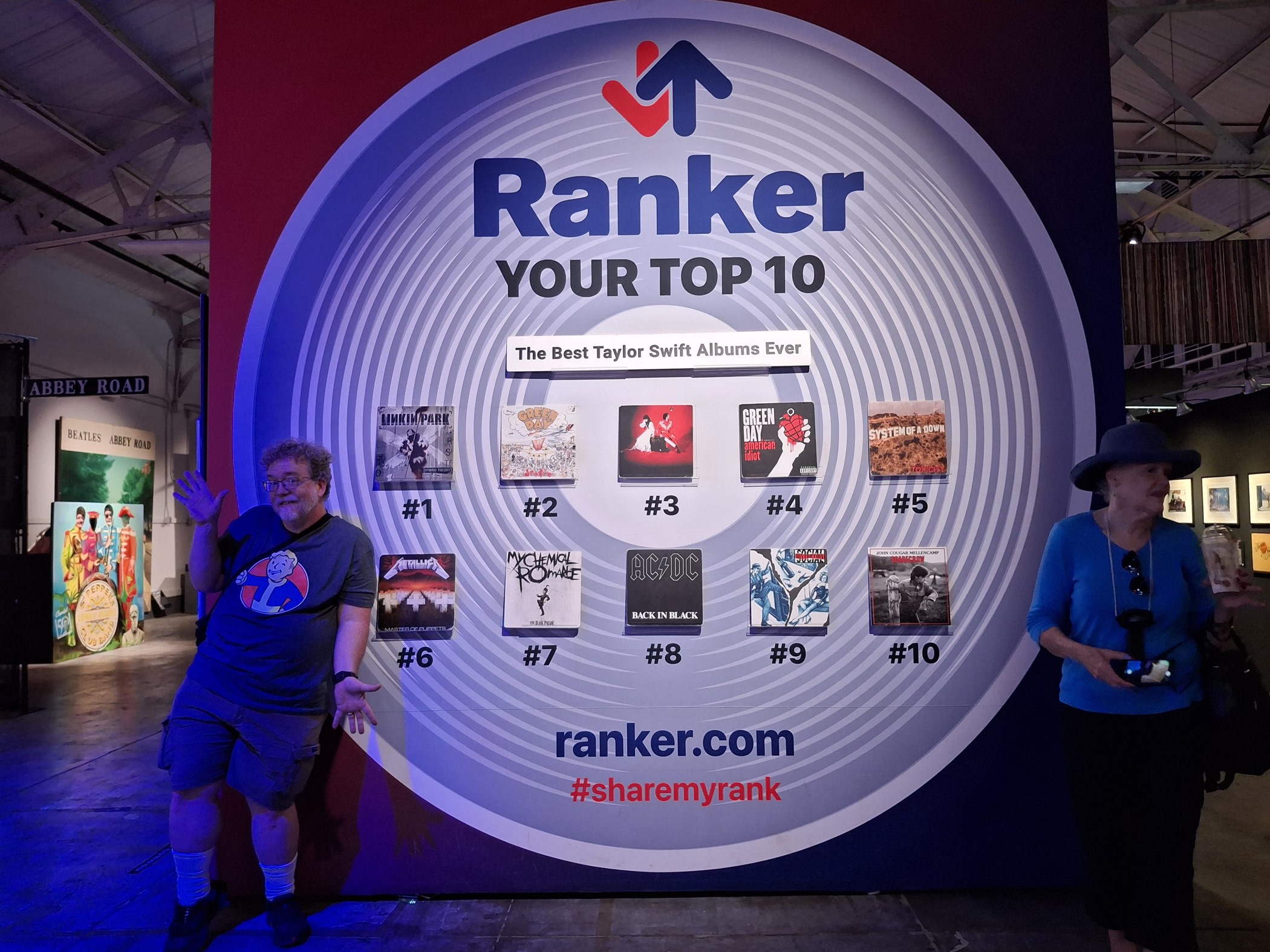 Among the exhibit’s interactive sections, my favorite let visitors display their own Top Ten lists for all the world to see. A four-row record bin contained copies of over 100 covers (no actual LPs) that they could insert into one of ten slots on a wall display, apparently sponsored by Ranker.com. You could also choose from a number of listicle titles to throw above them.