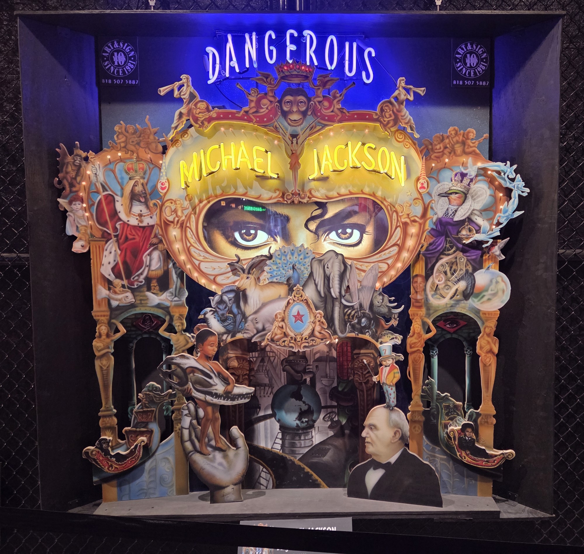 I don’t know if Indiana’s own Michael Jackson is still canceled in other states, but our local stations will never let him go. Anyway, here’s Dangerous recreated as a large light-up shadowbox diorama.