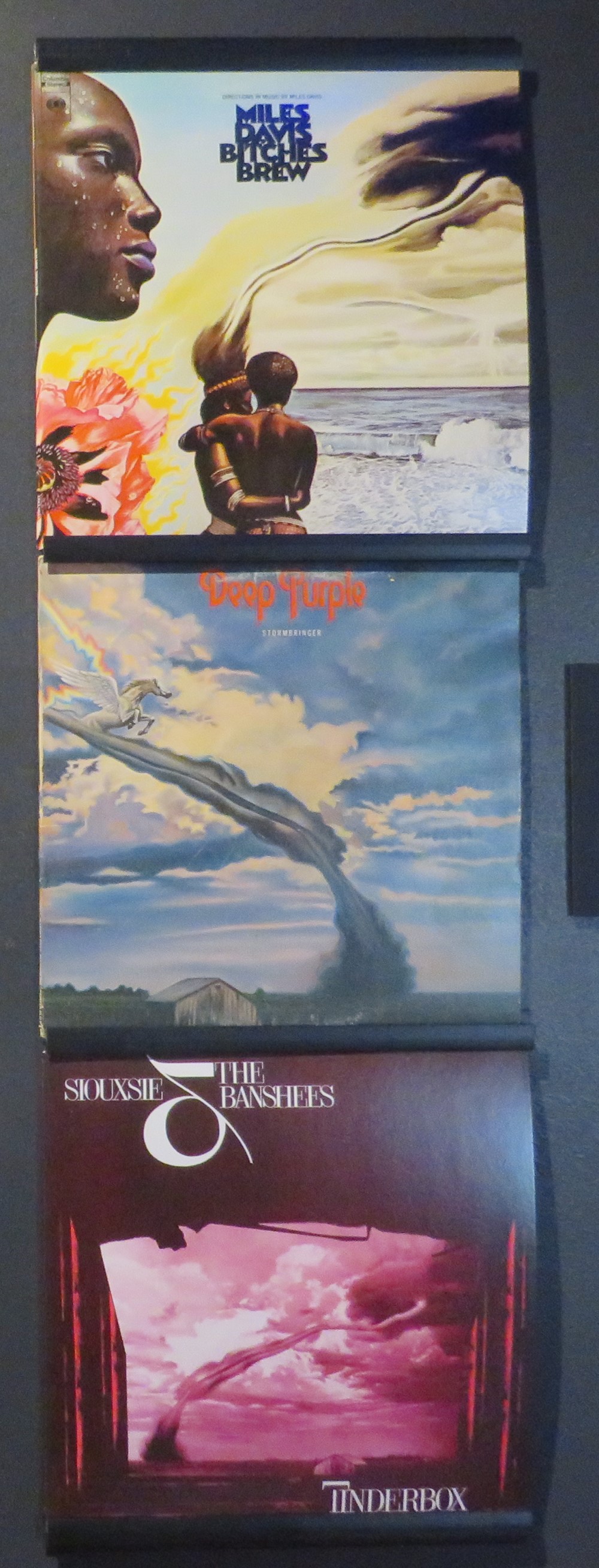In addition to those collections, the exhibit featured super-sized tributes to certain covers, accompanied by commentary. Some were blown-up copies, but many were painted reproductions, either of the entire covers or of excerpted images. I’m not sure if the latter idea was to forestall copyright issues or some fans with painting skills simply thought it’d be fun. It took a few minutes for me to realize this was why some images were a bit “off” compared to my memories. I made a game of seeing how many I recognized on sight without reading the credits. The honored albums skewed toward rock and reflected the curators’ preferences rather than any given Billboard list (e.g., three different albums by X), but a shocking number of them were in my musical wheelhouse. No one I know ever enters my wheelhouse.