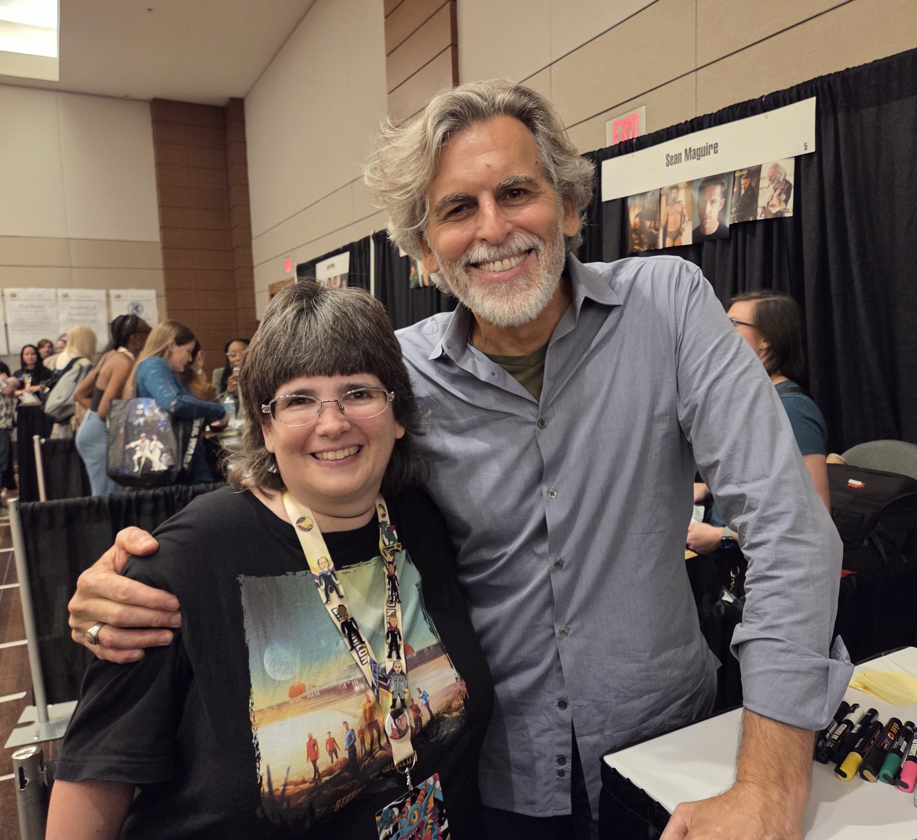 Sometimes we’re okay with meeting actors at their autograph tables rather than going for the upgraded photo-op experience. On the Walk of Fame — what D*C calls their actors’ autographing ballroom — our happy encounters began with Oded Fehr! He’s best known for The Mummy series, where his warrior Ardeth Bay is in charge of prophecy exposition. More recently he’s recurred in the later seasons of Star Trek: Discovery as Admiral Charles Vance, the 32nd-century head of what’s left of Starfleet after the Burn, whom he’ll be reprising in the upcoming Starfleet Academy series.
