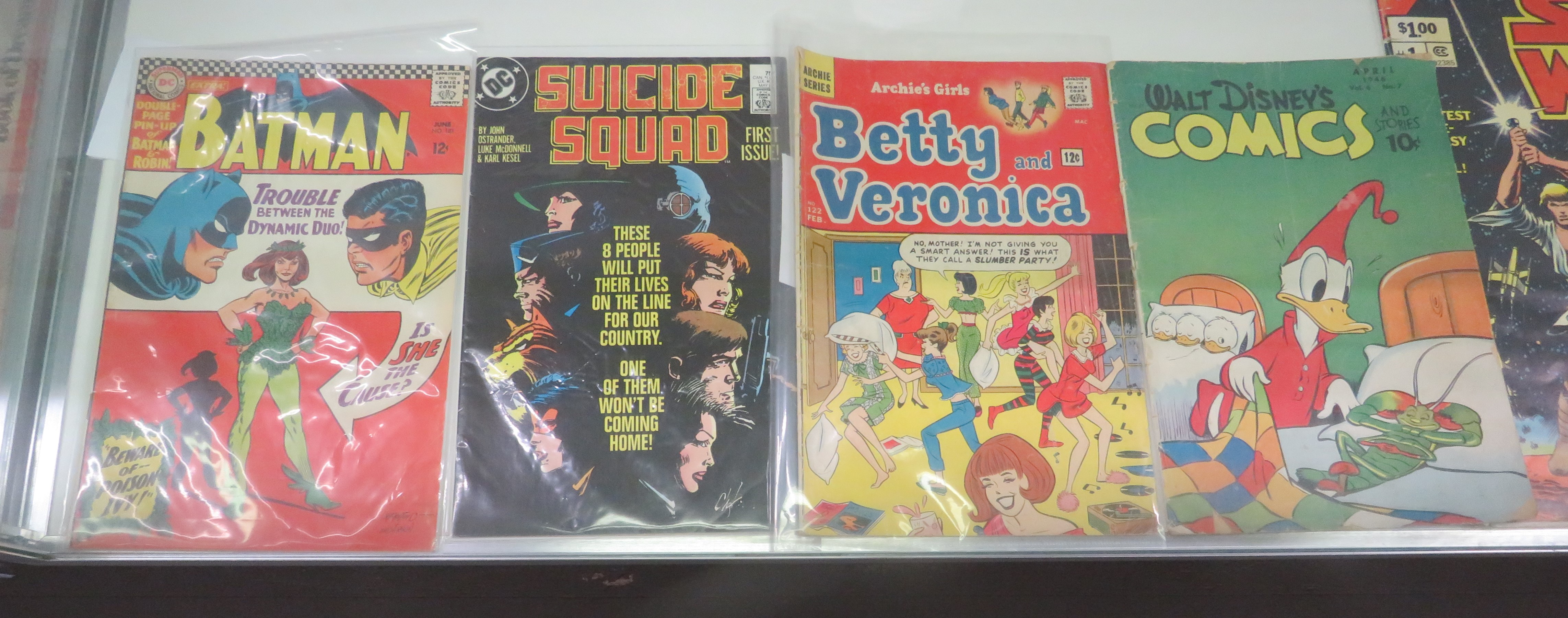 Batman #181 (June 1966); Suicide Squad #1 (May 1987), the only of these I have; Betty and Veronica #122 (February 1966); and Walt Disney’s Comics and Stories #67 (April 1946).
