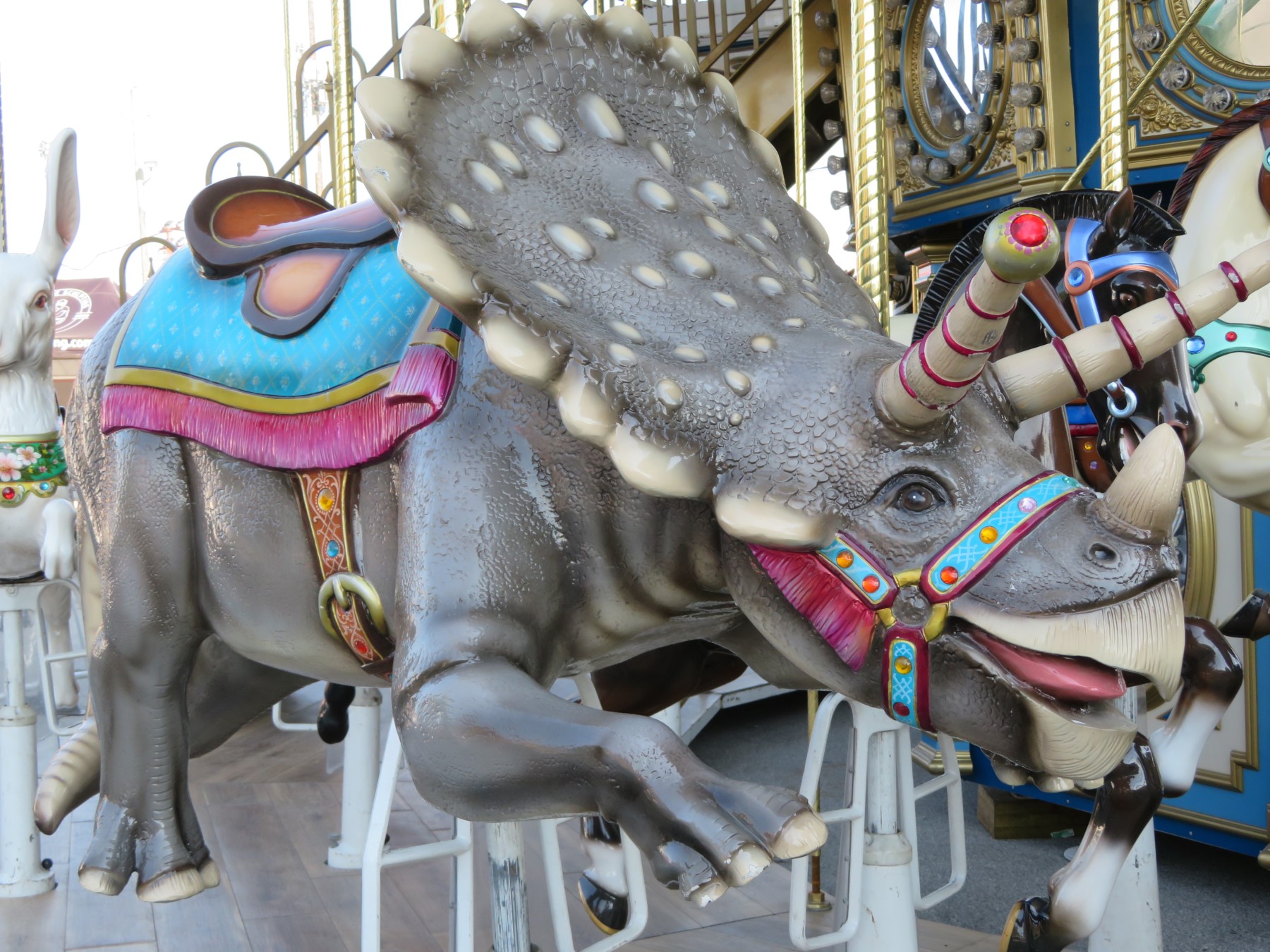 Once again the two-story carousel stood near our usual entrance. Its uncommon steed choices included a triceratops…