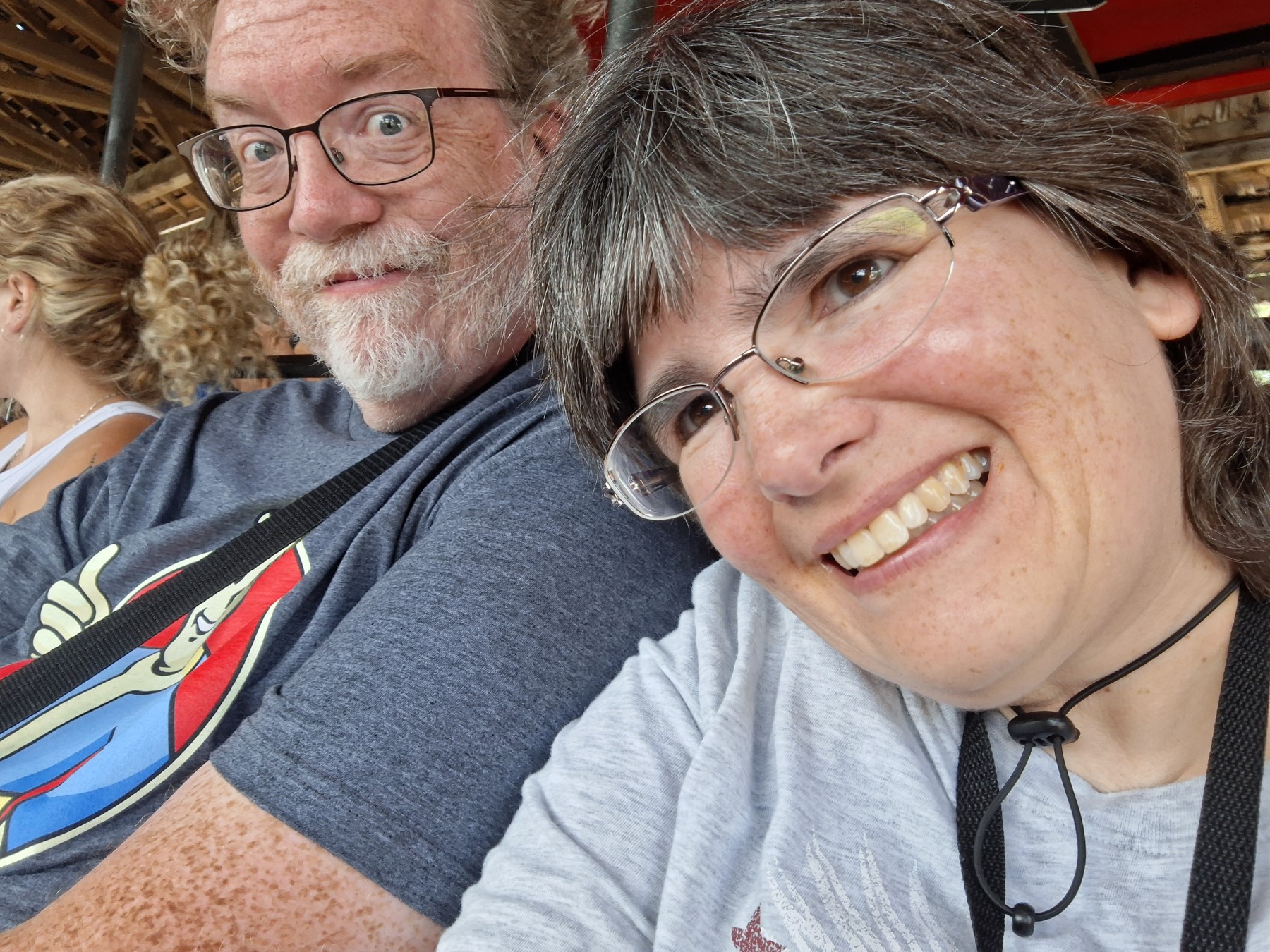 In closing, here’s a selfie Anne took while we rode around on one of the free shuttles. It’s my understanding we might be more beloved online and become the idols of dozens if I posted selfies more often. And, y’know, if we were thirty years younger, and thin, and cool, and spewed political tantrums after too much doomscrolling. We do what we can with what we were given. Whatever happens next is up to You, The Viewers at Home.