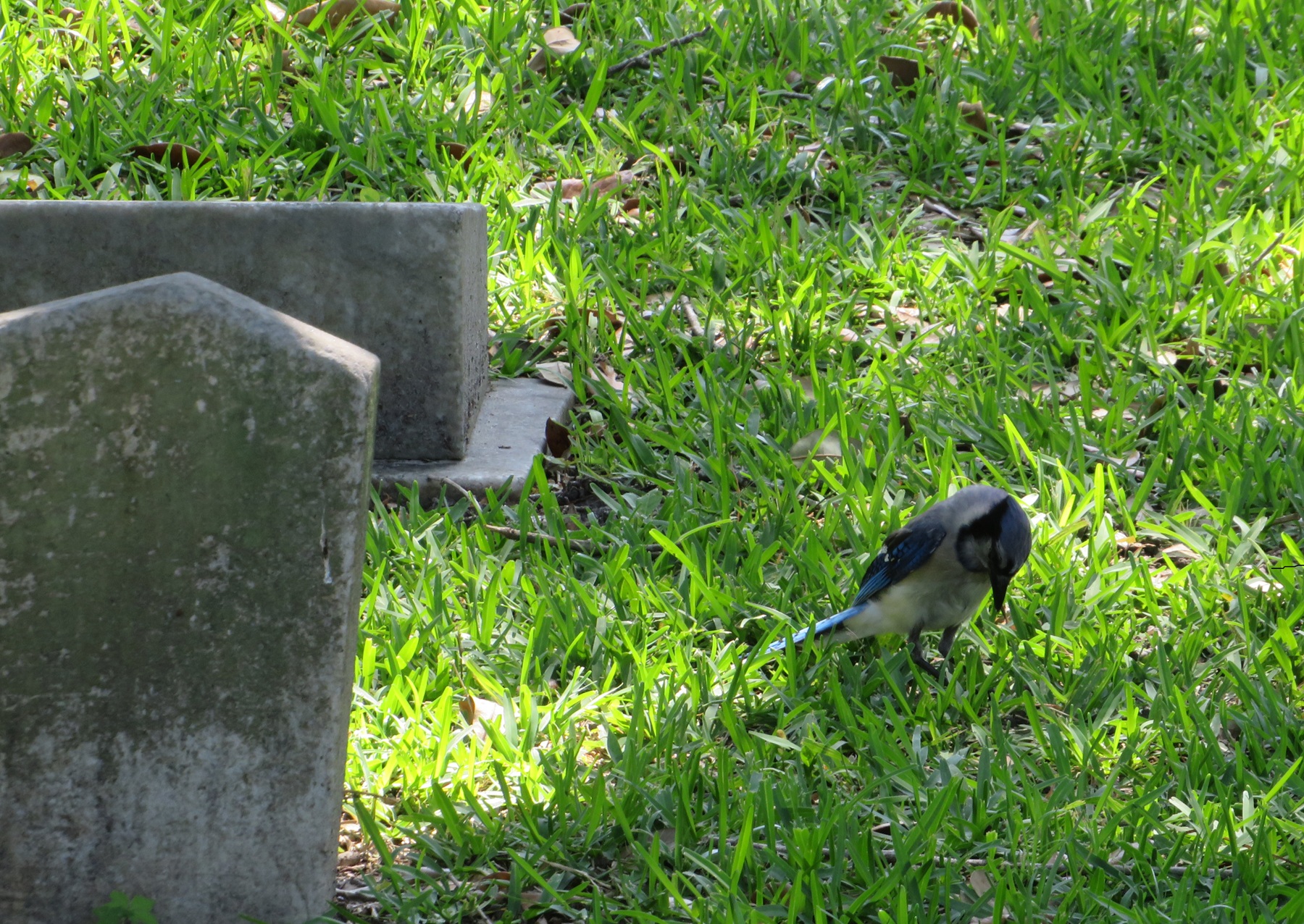 Blue jay in cemetery grass, poking at ground.