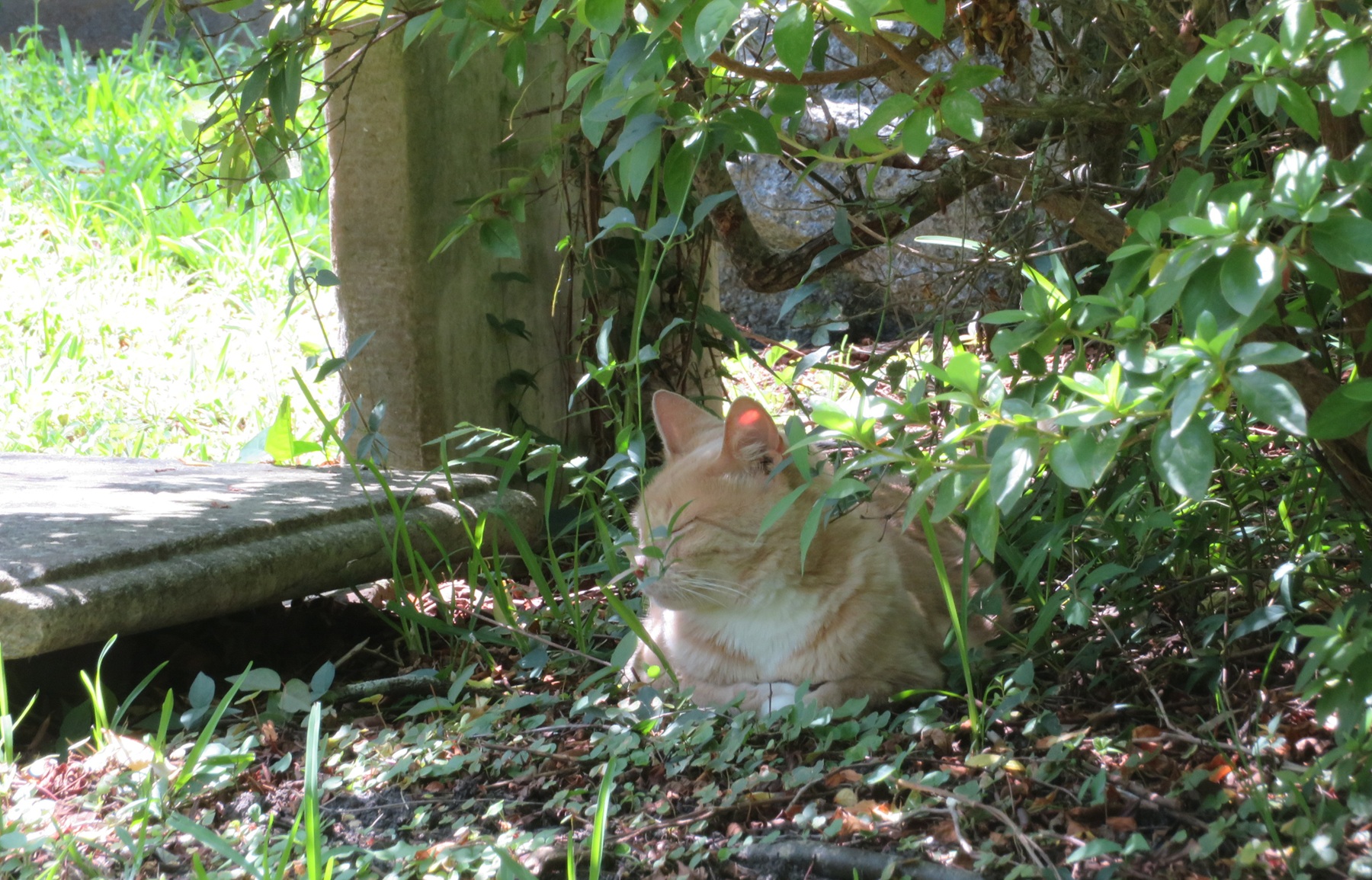 Stray pinkish-orange cat lies under bushes next to graves, eyes closed
