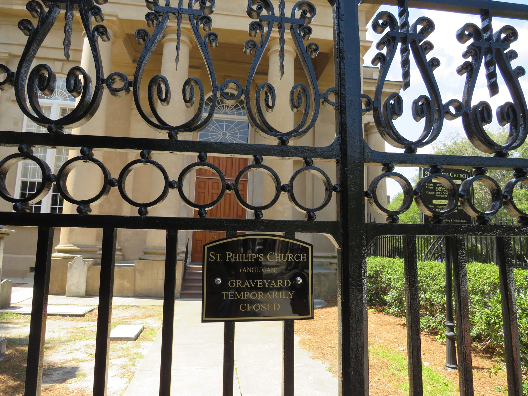 Locked gate to a church and cemetery, sign says "Graveyard Temporarily Closed"