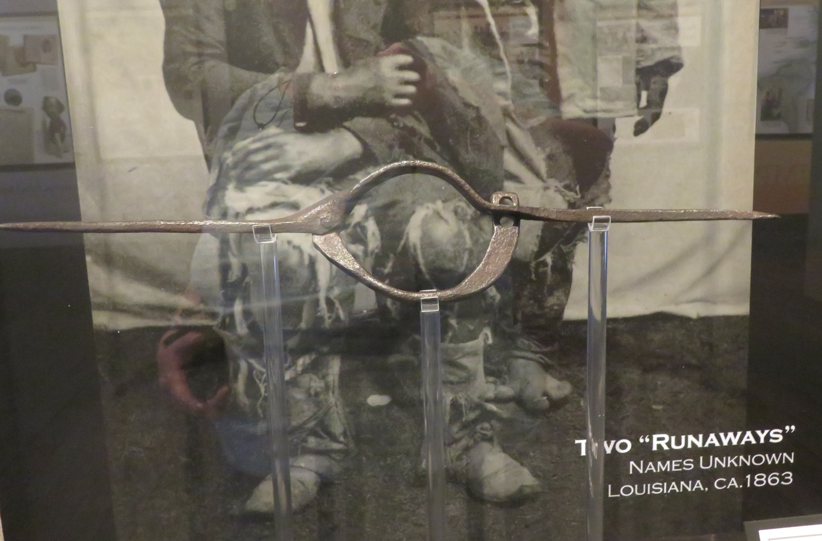 A metal slave yoke in front of a 19th-century photo of a Black couple posing.