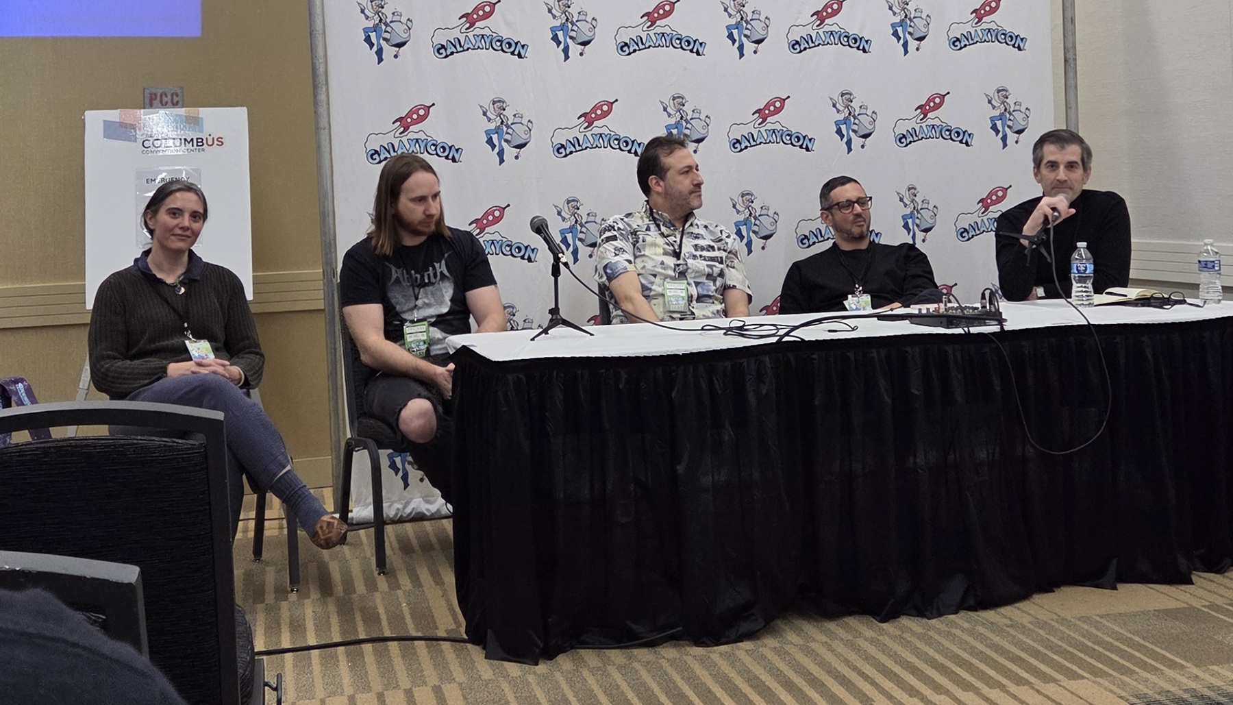 Four comics writers and a moderator at a white table draped in black.