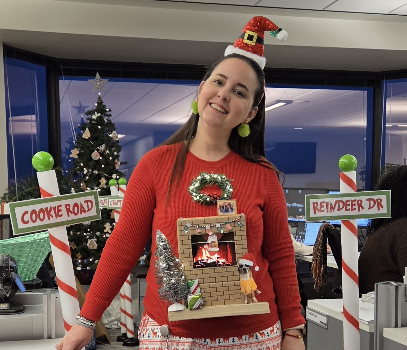 Fierce ugly Christmas sweater competition. Notice that fireplace on her sweater isn’t a drawing; that’s a diorama large enough for Barbie dolls to heat up marshmallows on a stick.