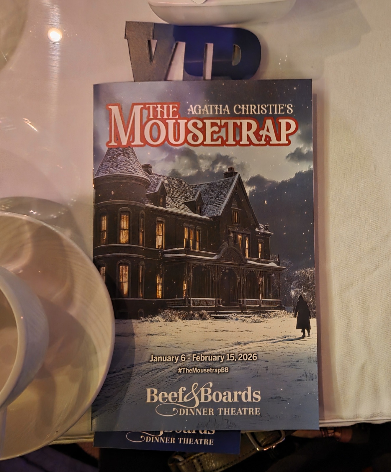 Beef and Boards' booklet for "The Mousetrao" running January 6 to February 15, 2026. Cover is a shadowy figure in front of a snowy inn at night.