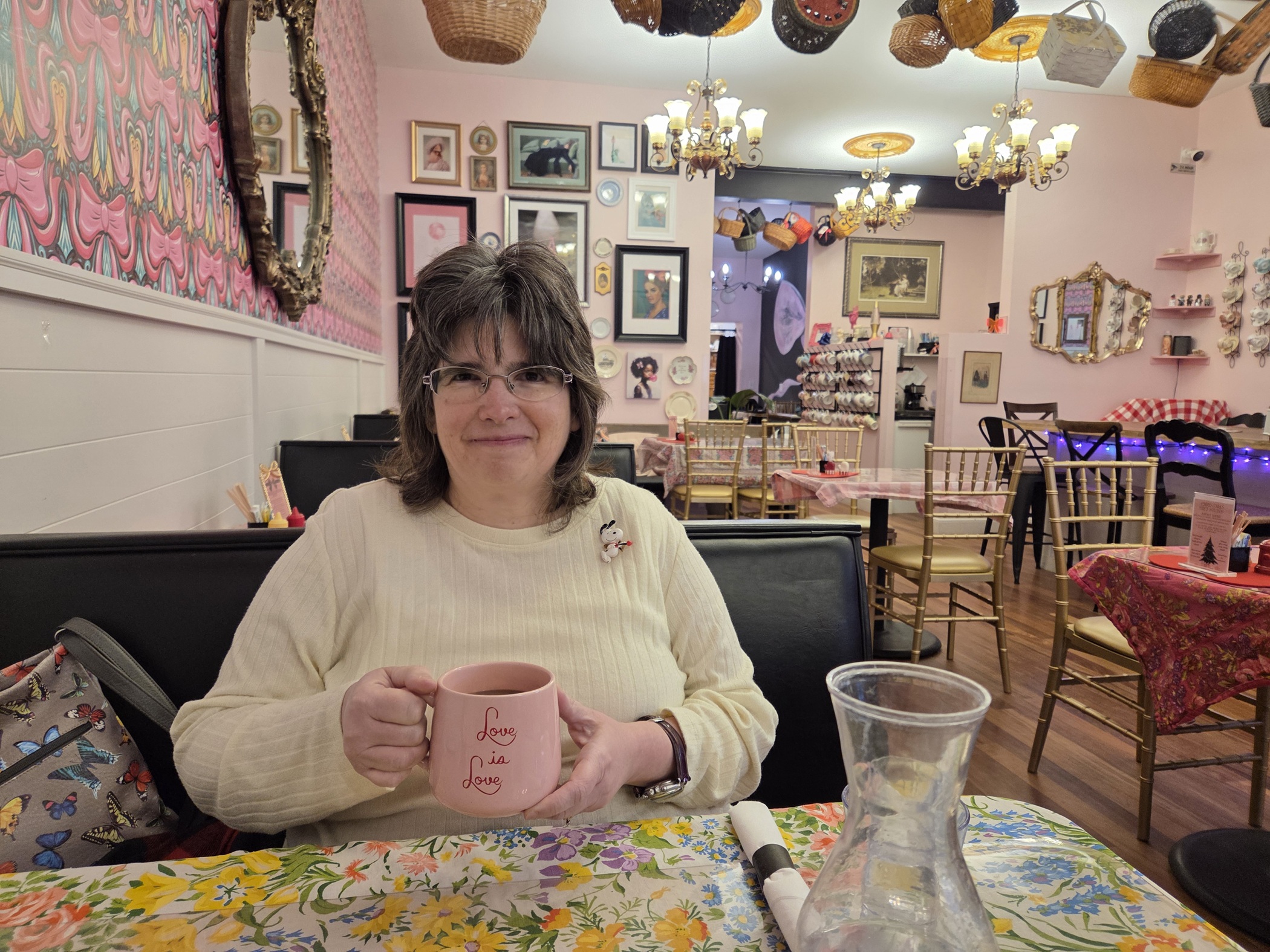 Anne sitting in a very pink restaurant, holding a mug that says "Love is love". Baskets hang from the ceiling.