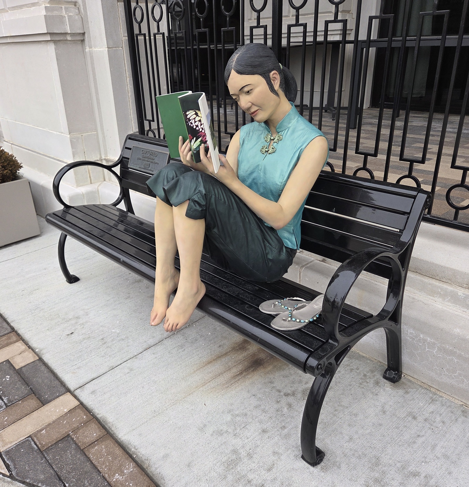 Statue of Asian woman curled up on park bench, reading a softcover nature book.