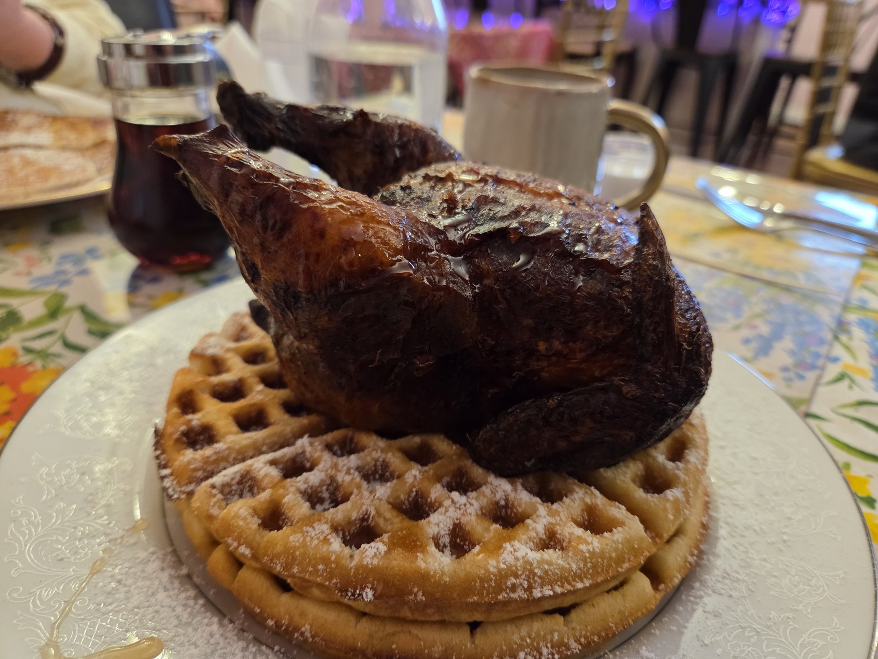 Nicely fried Cornish hen atop two waffles.