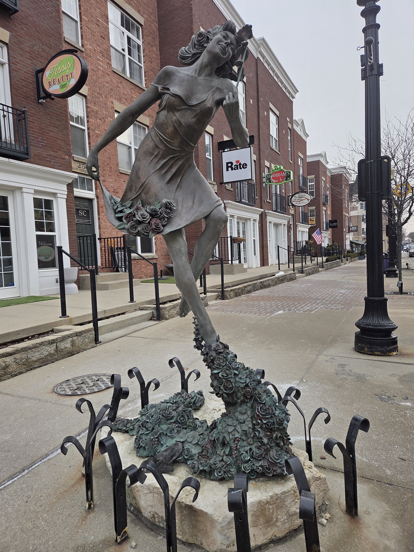 Statue of woman in negligee sniffing one rose, holding a bouquet in her other hand, flying in the air and leaving a trail of roses behind her.