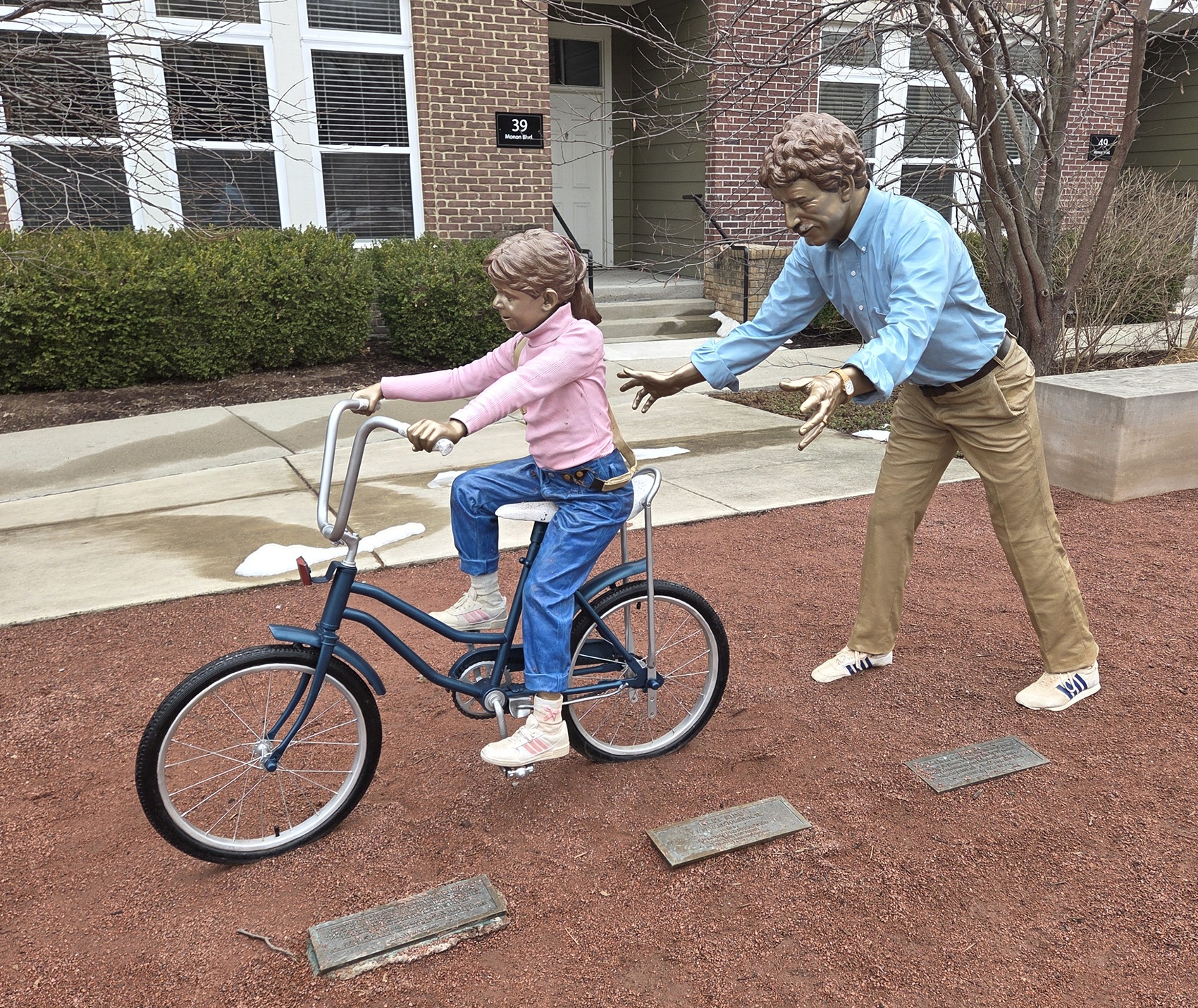 Statue of tiny girl in pink turtleneck sweater and blue jeans nervously riding a girl's bike with banana seat. Dad walks behind her, arms outstretched in case she collapses.
