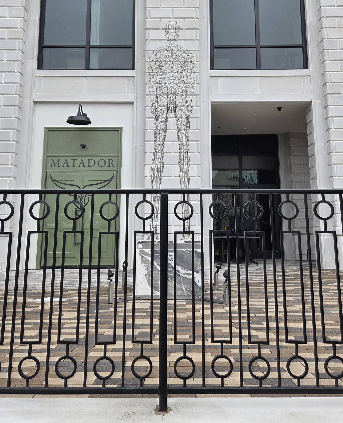 Wire sculpture of a tall faceless male in front of an apartment building called Matador.