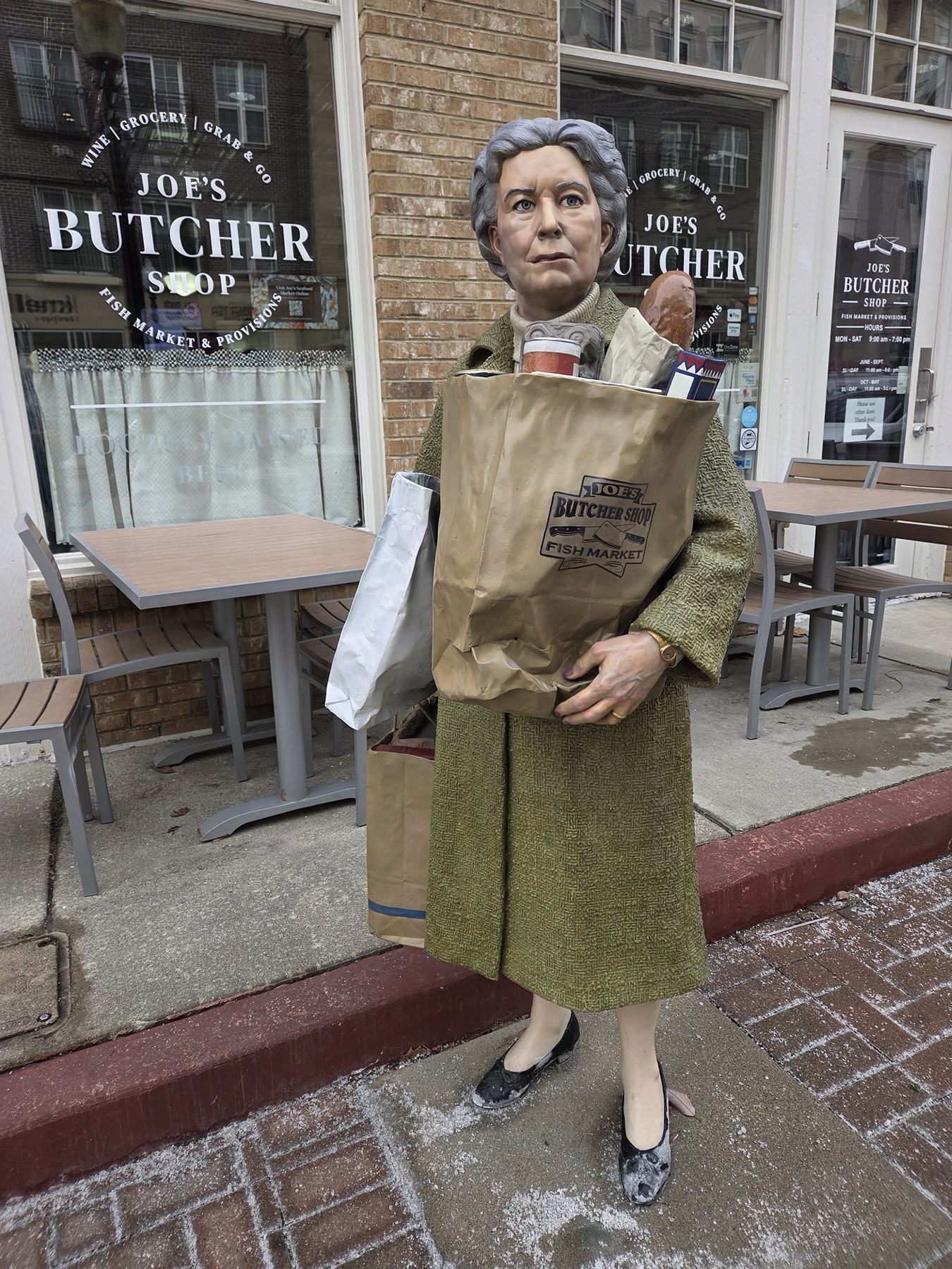 statue of matronly woman with her groceries, positioned in front of an actual butcher shop.
