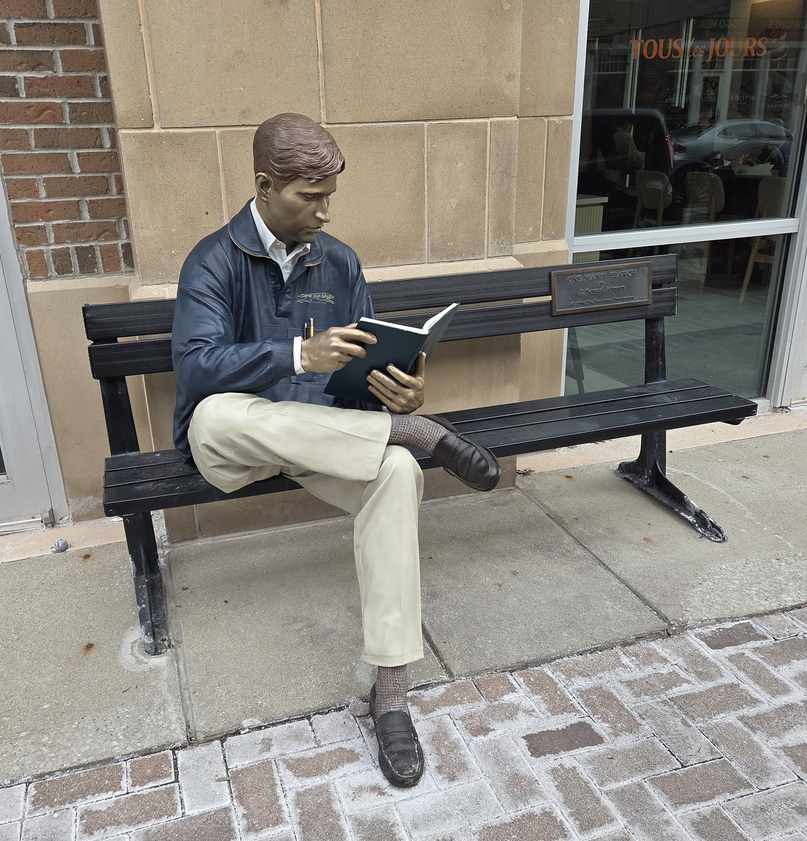 The art assortment includes 23 statues by a single artist: J. Seward Johnson II, grandson of one of the founders of Johnson & Johnson (whose “no more tears” shampoo was a childhood household staple I endured under protest), whose son J. Seward III was one of BuzzFeed’s co-founders. Under the aegis of their previous mayor, the city purchased the statues between 2005 and 2023, the last one installed after Johnson himself passed away in 2020. These entries from his “Man-on-the-Street” series, dispersed across multiple localities, illustrate a sort of throwback community mostly conforming to a “Forever Small-Town 1950s” motif. Carmel hasn’t been a small town in decades, and definitely didn’t spend like a small town to acquire these. The Indianapolis Star compiled a complete list of locations, dates, and price tags.