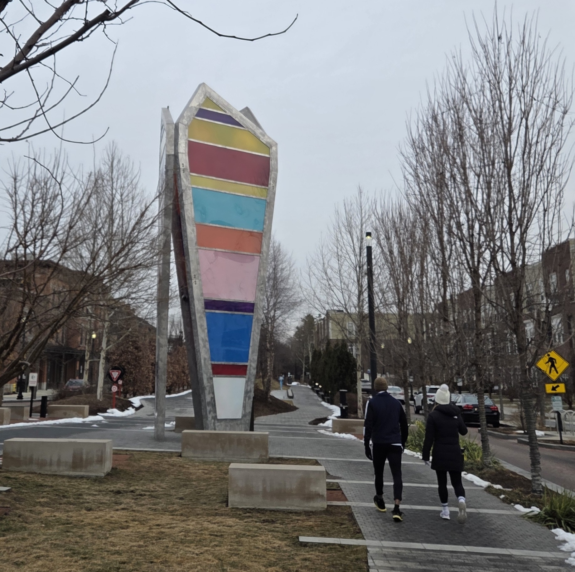 sculpture of three disproportionately tall pentagons with colored stripes, installed along a bricked trail with two passing walkers.