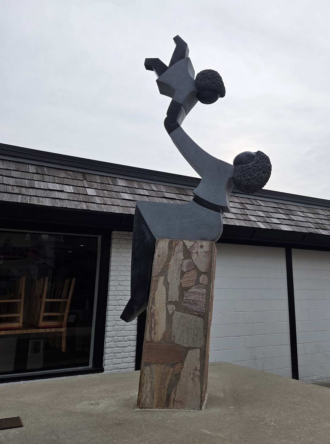 Stylized statue of Black mother happily swinging her toddler high in the air by both arms. Both are faceless. A restaurant is behind them.