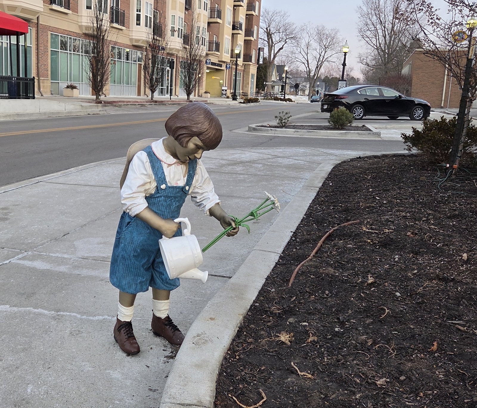 Statue of Buster Brown in blue overalls with a watering can and three plucked long-stem flowers that can't just replanted that easily.