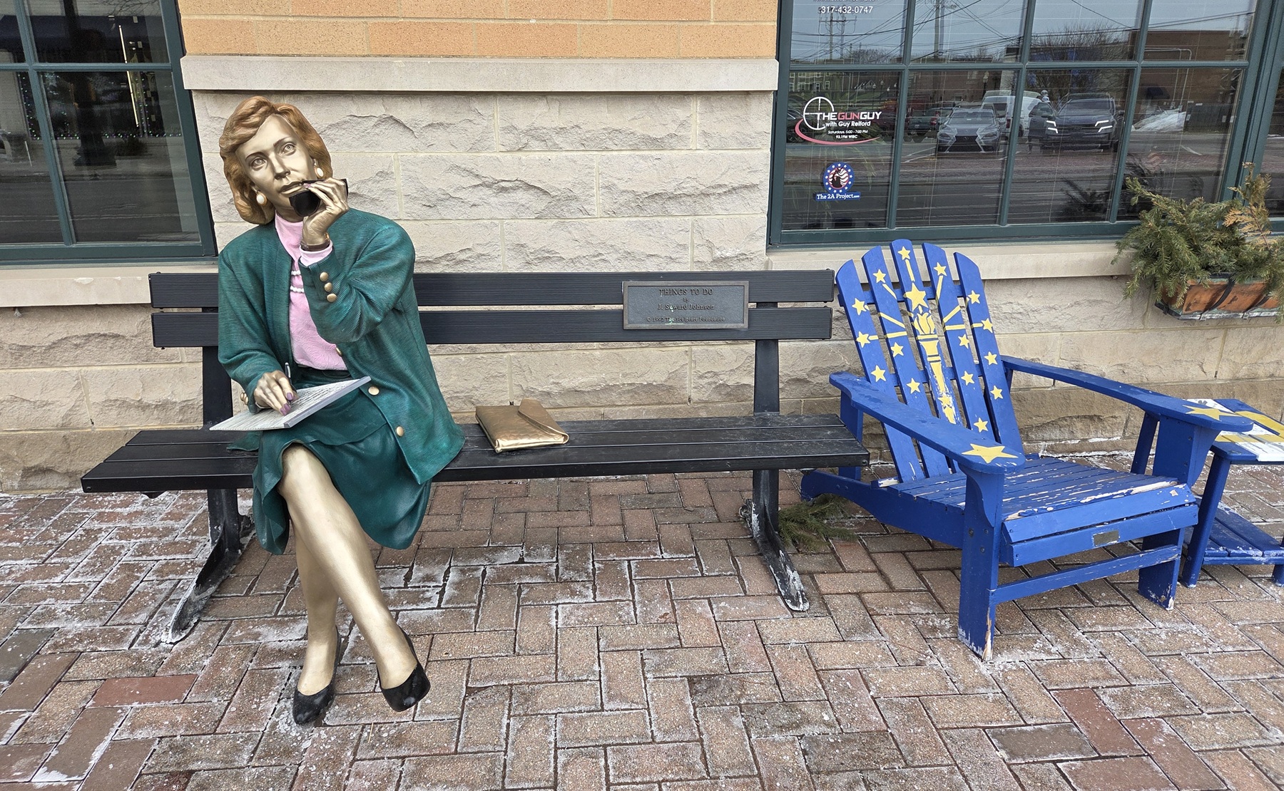 Statue of Miss Hathaway with legal notepad, pen and 1950s smartphone sitting on metal bench. Next to it is a blue deck chair with yellow torch and stars from Indiana's state flag.