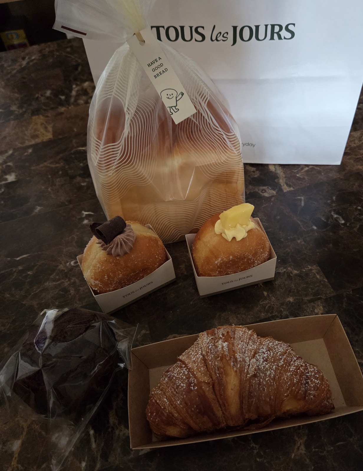Our haul: one chocolate creme donut, one matcha creme donut, a strawberry croissant snack sandwich, a hazelnut-filled chocolate muffin, and a loaf of mascarpone cream bread.