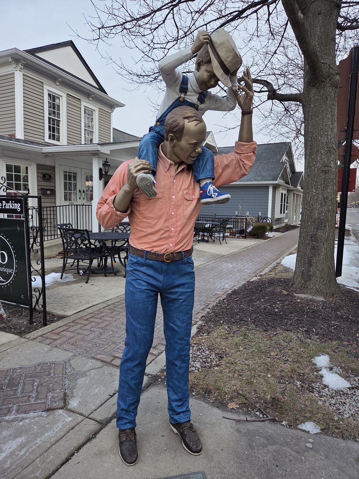 statue of dad carrying son on his shoulders. Son wears tiny overalls and dad's white hat.
