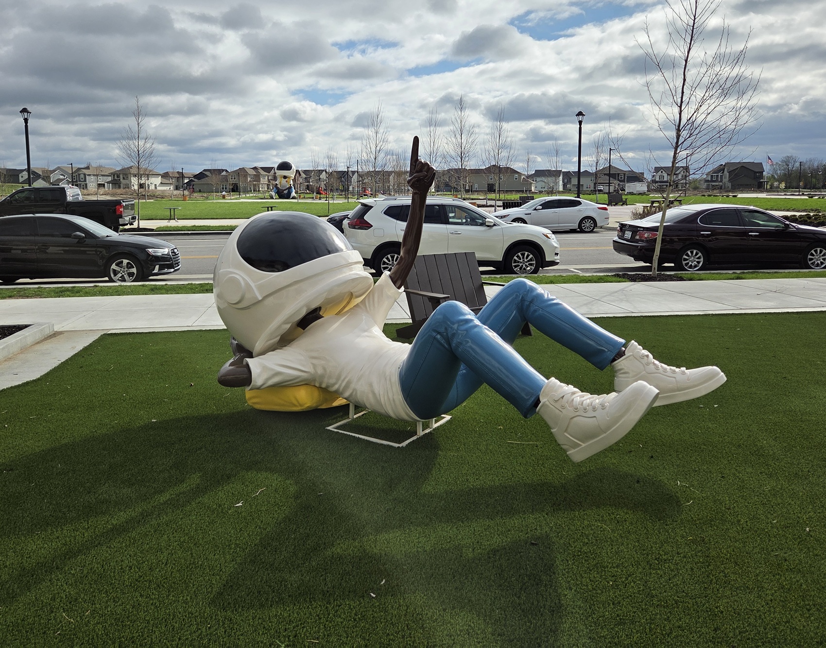 Previously on Midlife Crisis Crossover: in between our conventions and road trips, sometimes my wife Anne and I find new sights in our own Indianapolis backyard. On this very Easter morning we discovered a new park in nearby Plainfield that we’d heard nothing about until I looked it up just now. In light of the ongoing saga of the ambitious Artemis II Moon-orbiting mission that’s been a promising endeavor and a welcome distraction from everyday headline hysteria, it was fun to spend a few minutes with a super-sized astronaut of sorts.