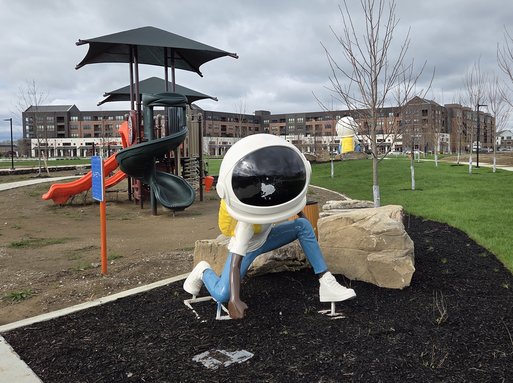 Last month Plainfield officials unveiled the 25-foot statue in our lead photo — The Dream Gazer, the centerpiece of the newly dedicated Swarn Park. Still a work in progress, the park is located in the neighborhood of Hobbs Station, a $300 million mixed-use development resembling some of the upscale suburbs we’ve encountered in our travels, such as our very own Carmel up in Hamilton County. (Read: houses starting in the $400K range and up, apartments for $1400-$2500/month, etc.)