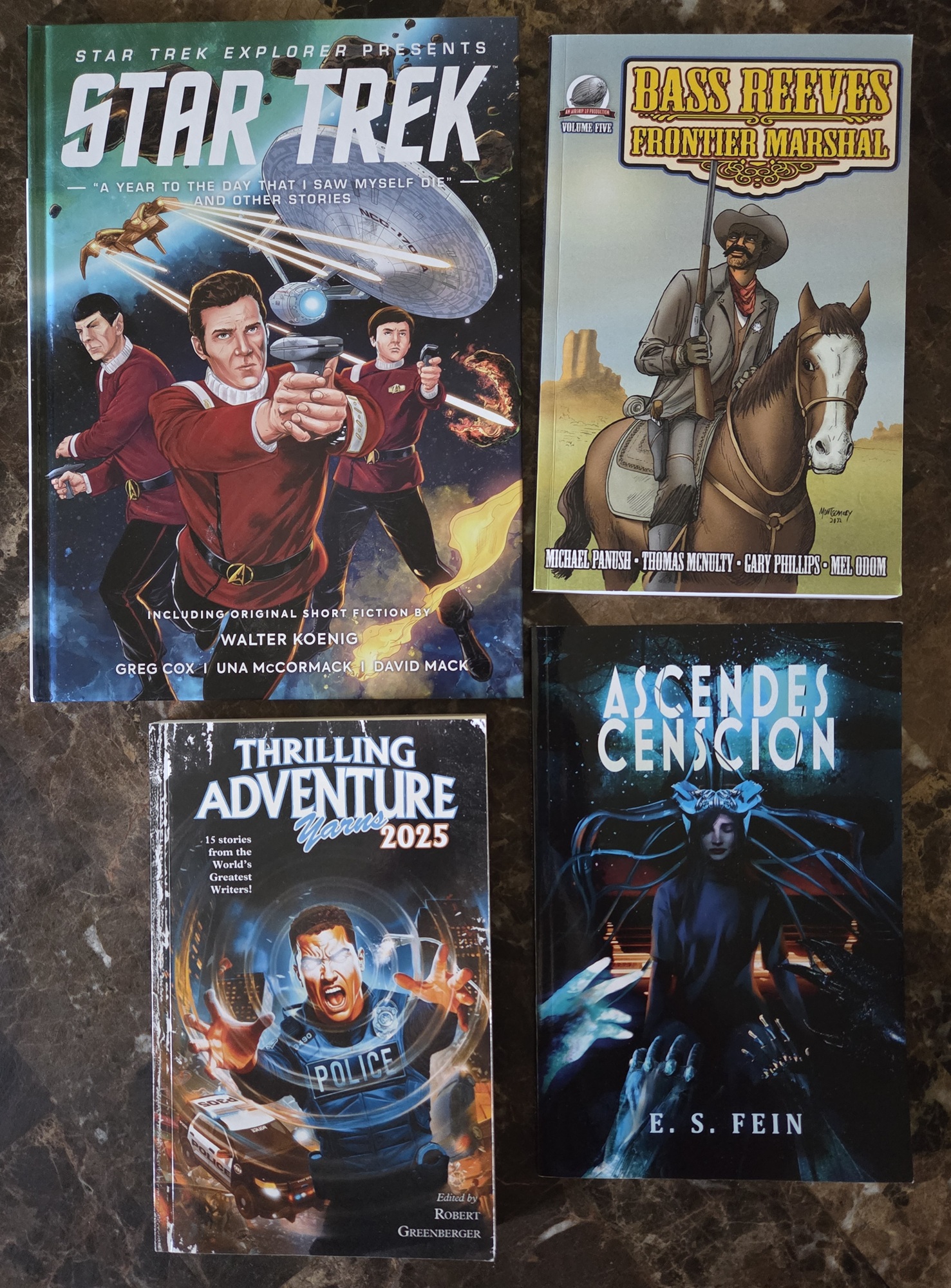35. Robert Greenberger, ed., Thrilling Adventure Yarns 2025 (uh, 2025). The pulp-fiction anthology series’ most recent Kickstarter reward elicits tales from a variety of familiar names from SF and comics past. I missed any and all previous volumes, but adding Christopher Priest to a roster is nearly always enough to divest me of my cash. His complicated cop drama was of course worth the pledge, but other winners include Michael Jan Friedman’s Professor Mystic, very much in the mold of Silver Age superheroes with oddly specific weaknesses; and roman à clef meta-fiction from longtime Superman writer and novelist par excellence Elliot S! Maggin, who draws from his own experiences about how DC swept away their continuity in ’85 and broomed a lot of older writers like him out the door. The most out-of-the-blue choice to us newcomers: Win Scott Eckert’s revival of Irma Vep, the master thief from the French silent-film serial Les Vampires — proof positive that any IP in world history is ripe for a comeback in the right fan’s hands.