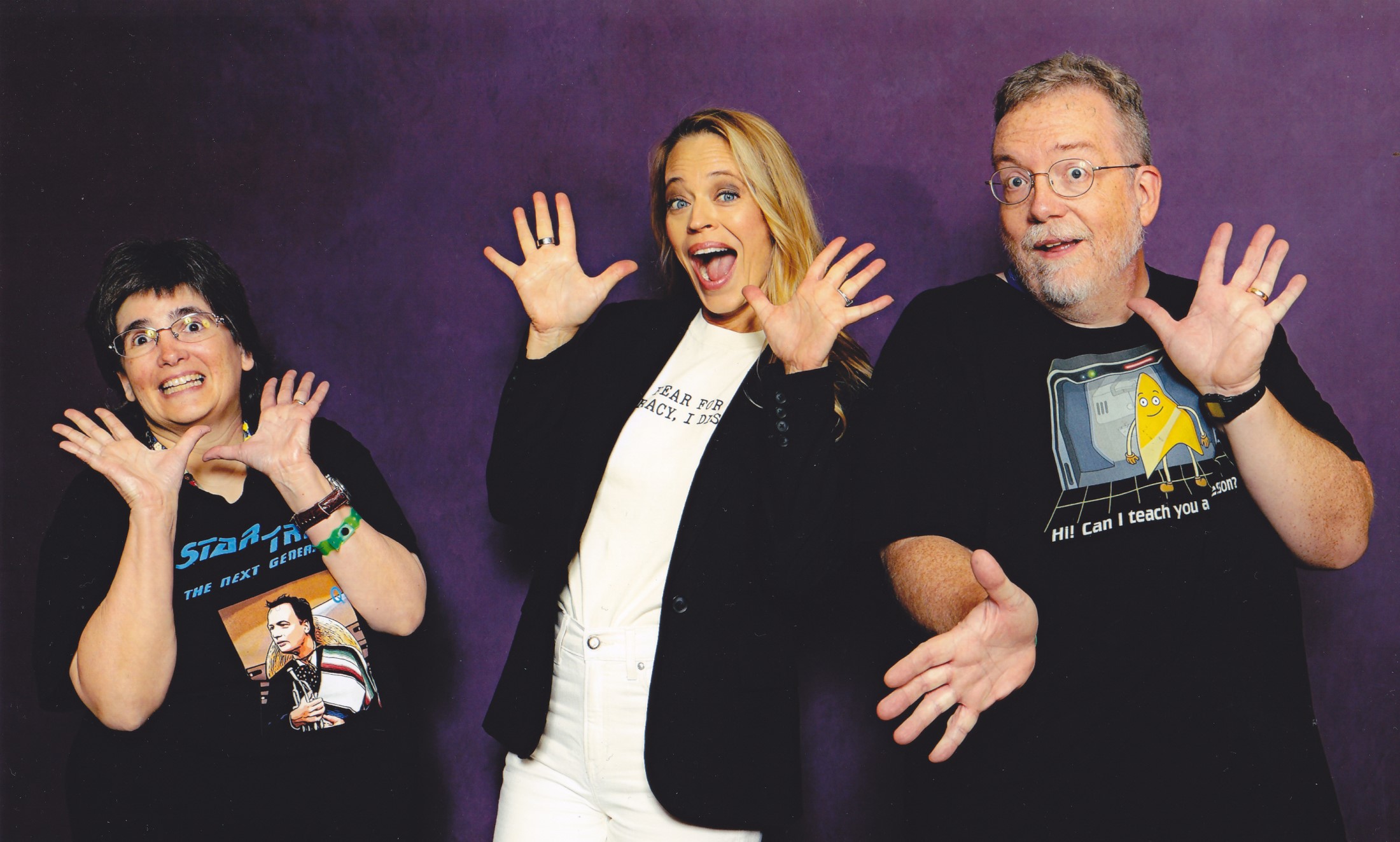 Two years later, here we go again! Creation Entertainment, one of America’s longest-running convention companies, runs an annual Trek gala in Las Vegas that invites scores of Trek cast and crew members to mingle with fans at Vegas prices and at a considerable remove from more than a few states. As a sort of outreach to us faraway fans, in 2024 Creation has launched a “Trek Tour” comprising much smaller versions of that vaunted Vegas show on the other side of the Rockies. Two weeks ago they brought the fan-magic to Nashville; forthcoming stops are scheduled in New Jersey and Dallas. This past weekend it was Chicago’s turn. The location was convenient and the guest lineup included so many missing names on Anne’s Trek-actor checklist, we did something we haven’t done in ages: we attended all three days, from the opening minutes Friday morning to the very end of the final panel Sunday night.