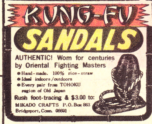 Hey, kids! If you’re chasing your dream of becoming a world-class martial artist like Bruce Lee or Jim Kelly or Chuck Norris, you’ll need proper footwear. And what better footwear than used sandals once worn by the great Oriental Fighting Masters? Either they outgrew them, saved up to buy better ones, or died fighting in them, and now they can be yours for just three bucks and a crude outline of your own foot on notebook paper, so we can tell which dead masters wore your size. We’re located up in scenic Connecticut, where all the most renowned sensei live. Send us your allowance today!