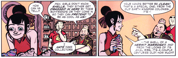 Of the other two stories, I faintly recall Neozoic as another FCBD vet, but I don’t remember their previous installment(s). The sample resembles Terra Nova with a sword, some ESP, and unexplained backstory that kept the plot in the dark. I have no idea, for instance, why one character wallops another with a triceratops head. Bonnie Lass explains its pirate-based plot, but not its characters or an explanation for the inclusion of elevators and interrogation rooms in its settings. Extra points lost for misspelling “breach” as “breech” at a crucial moment, to considerable amusement on my part.